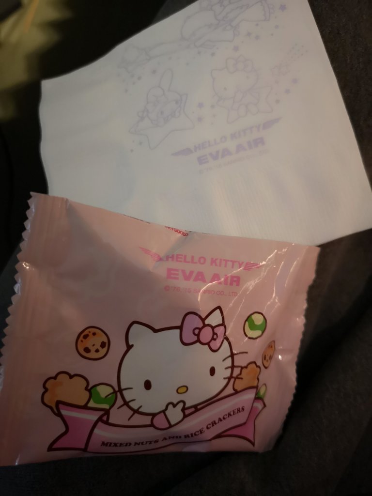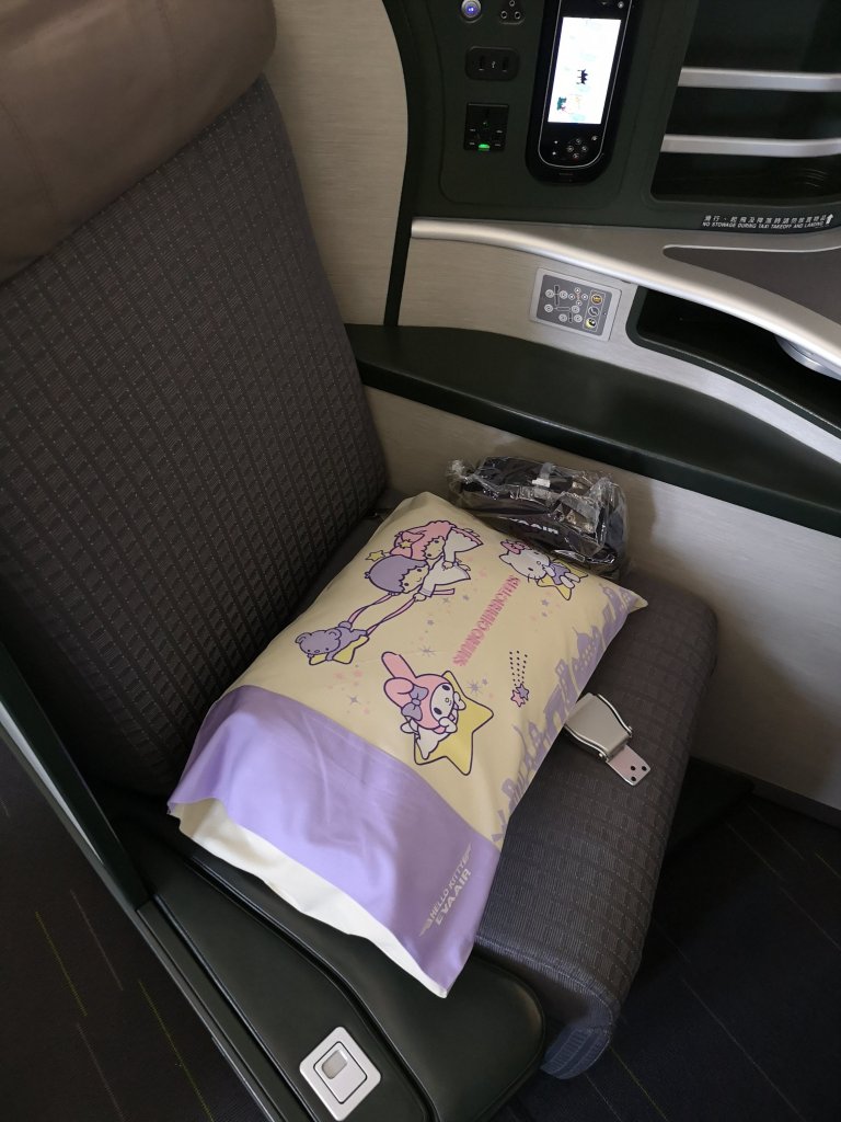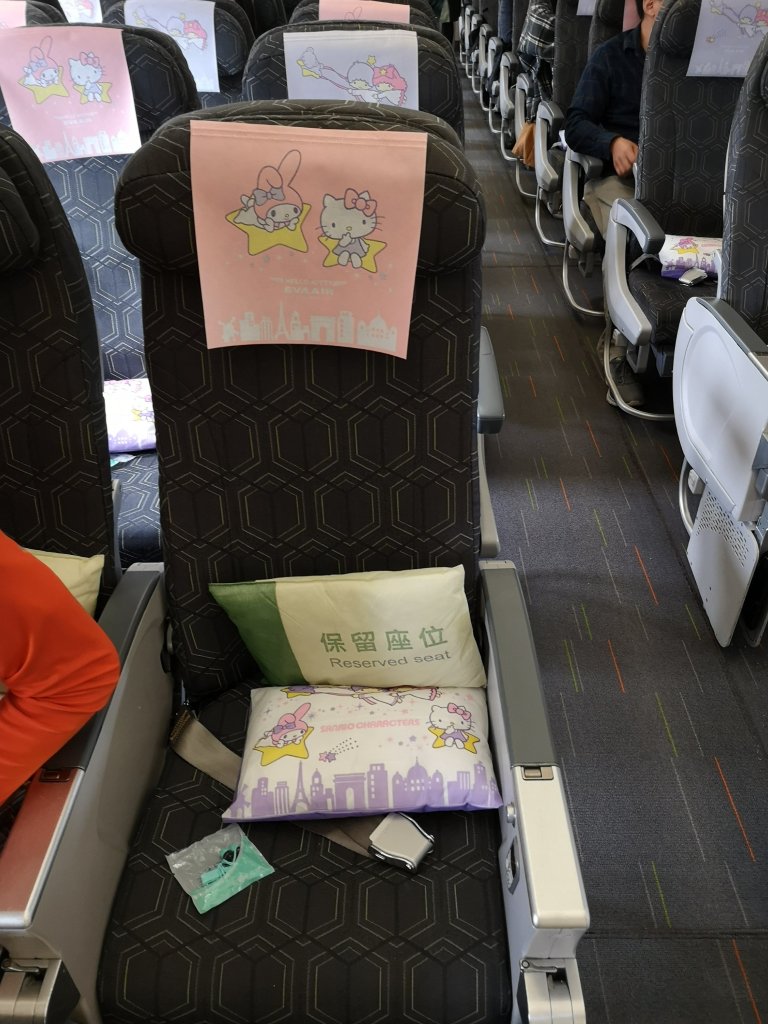 I am sitting in Emergency Exit seat 60J on this Airbus A330-200 (I think) Eva Air ‘Hello Kitty’ flight from Taipei to Singapore.