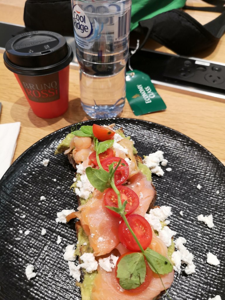 I choose ‘Peroni Stile Dining’ and order a wanky smashed avacado, feta, and smoked salmon on Rye, with a double espresso and a bottle of water. Still doesn’t hit $36 but there is nothing else I want.