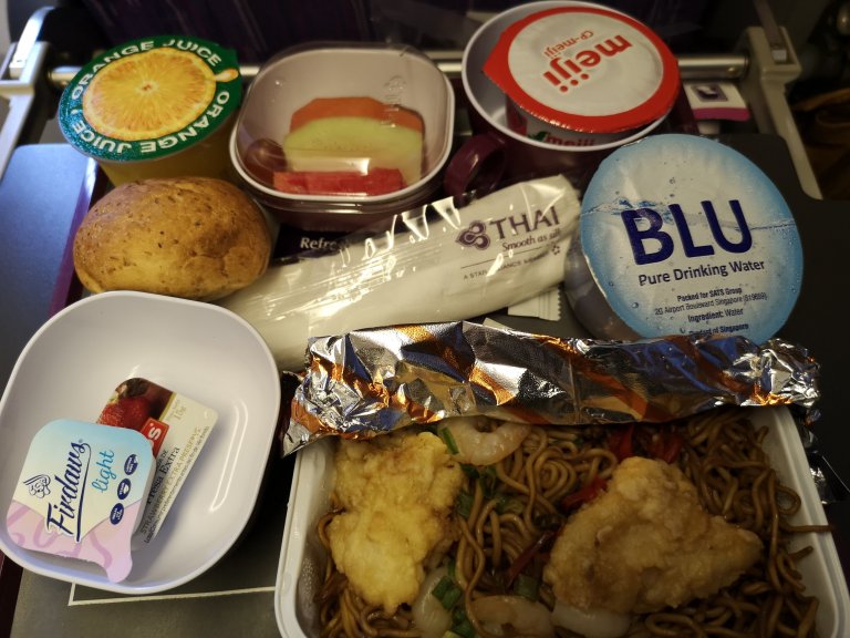Shortly after take-off the meal service starts and I have pre-ordered a Seafood meal, which is quite tasty and comes out first. Fried seafood noodles, fruit salad and yogurt, a roll, and coffee.