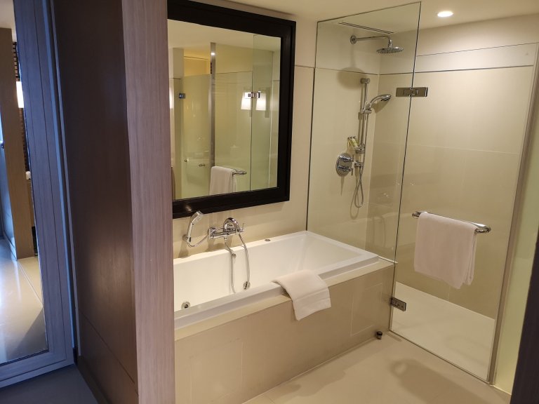 The room is indeed spacious with a separate lounge and dining room, work desk, 2 bathrooms, the ensuite with a spa bath, and a luxurious king sized bed.