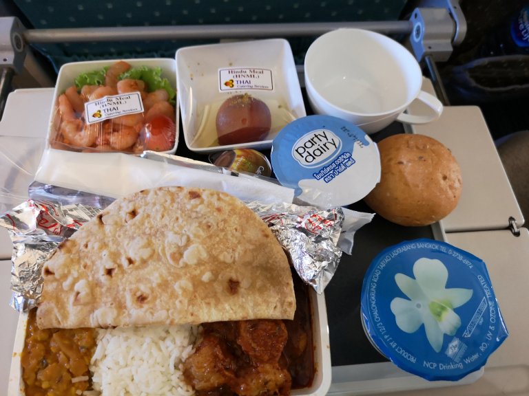 I have pre-ordered a Hindu Non-Vegetarian meal, which comes out first with all the other special order meals. Its kind of a shame I ate so much in the lounge as it is quite good – a fish curry with rice, Dahl, and Chapatti, yogurt, a sweet Indian dessert, and a Singapore Sling (or rather 2 😜).