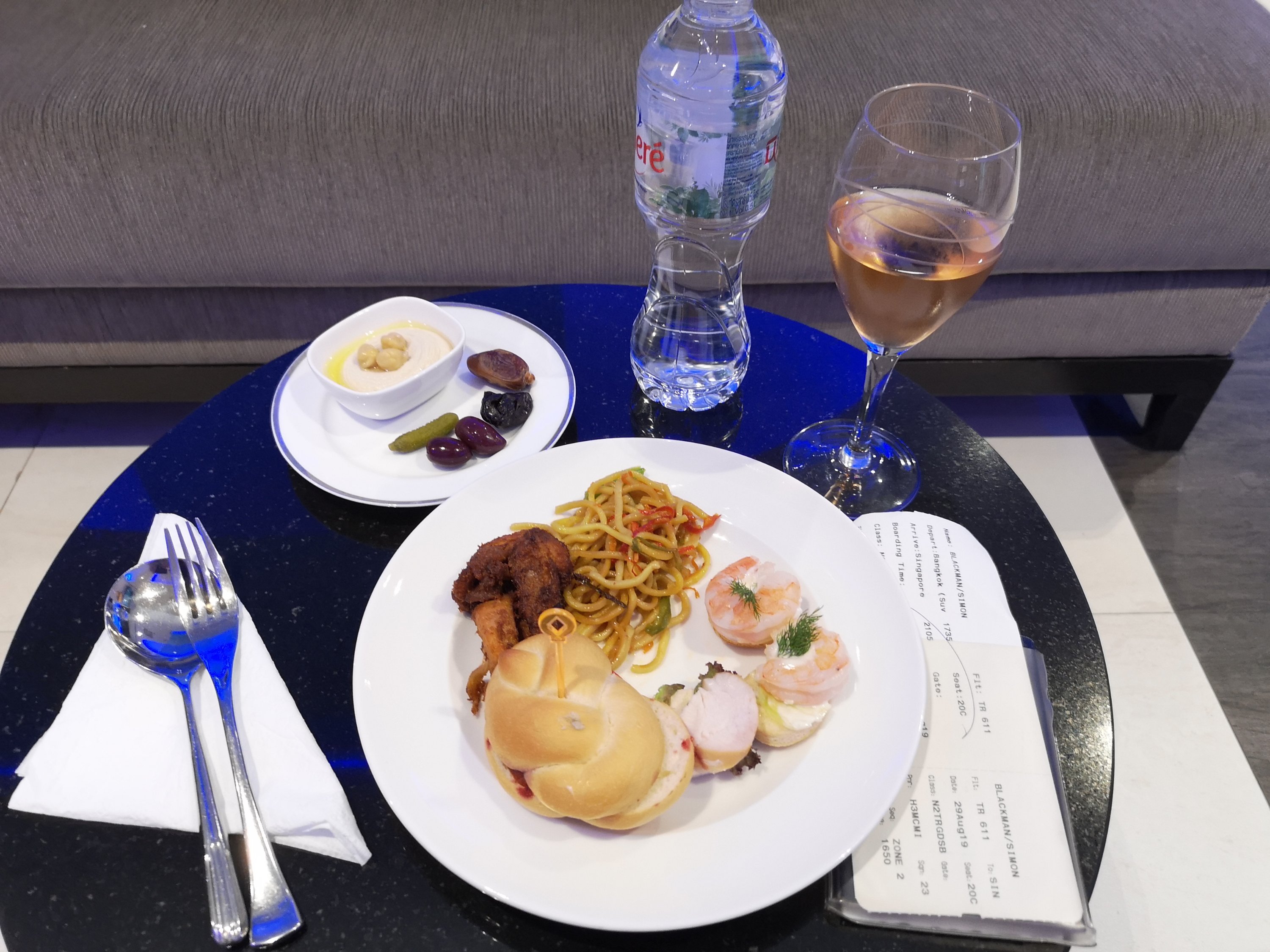 And a great decision to do so as it is relatively empty, and the food as always is outstanding. In fact, as soon as I sit down, I get up again and fill a plate with delicious middle eastern and Thai dishes from the buffet. Think Hummus, Pita bread, curries, fish cakes, and noodles. Yum! And the drink selection is pretty good as well. Sparkling red and white, port, Baileys…all of my favourites. And since I’m shortly flying Scoot (with no meals), I take advantage of the offerings.