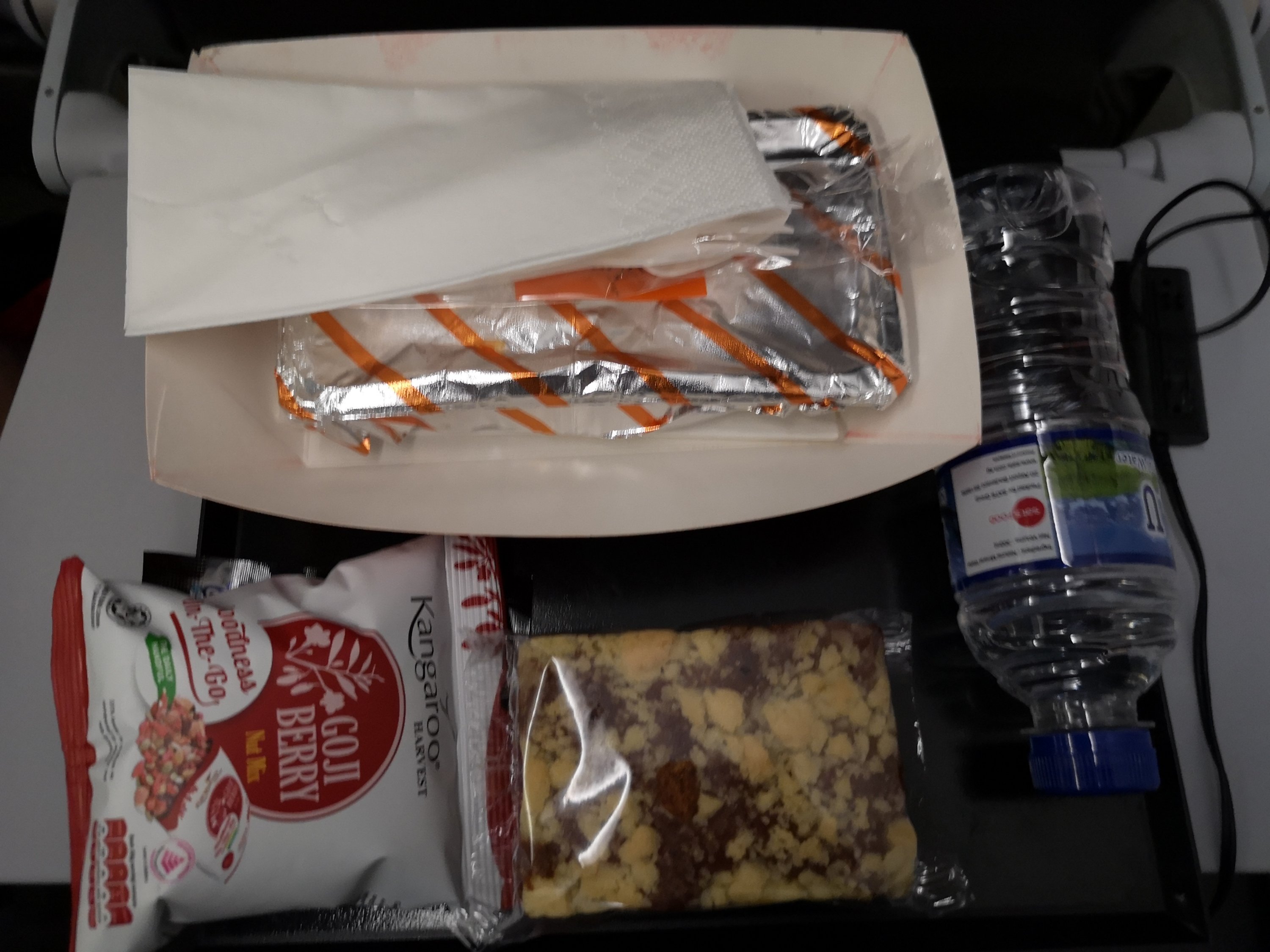 The pre-paid meal I have chosen is a Japanese-style beef Gyu-Don which comes with water, a coffee cake slice, and some mixed nuts. It is exceedingly expensive for what you get at $22, but as this is a work trip, it can be expensed.