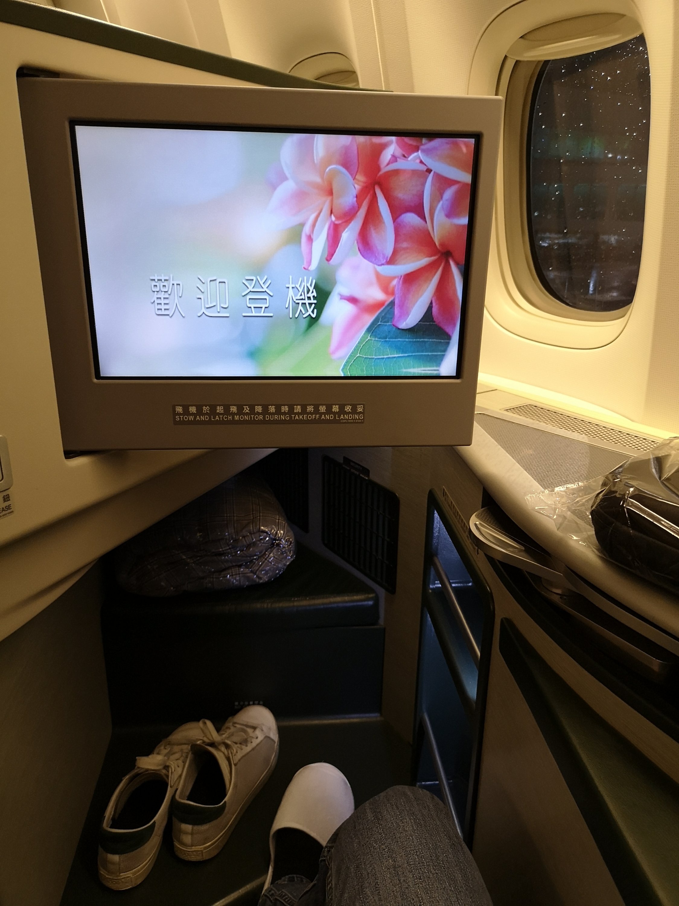 Upon entering the cabin I panic at the insistant crying of a baby which thankfully only lasts for 20 minutes and then makes no more sound for the duration of the 10 hour flight. My seat is a proper business class seat with all the bells and whistles; great storage, large TV screen, a fully-flat (and comfy) bed with thick duvet cover, and comes with over-ear noise-cancelling Headphones and a Rimowa amenity kit. And a pair of designer PJs 😊.