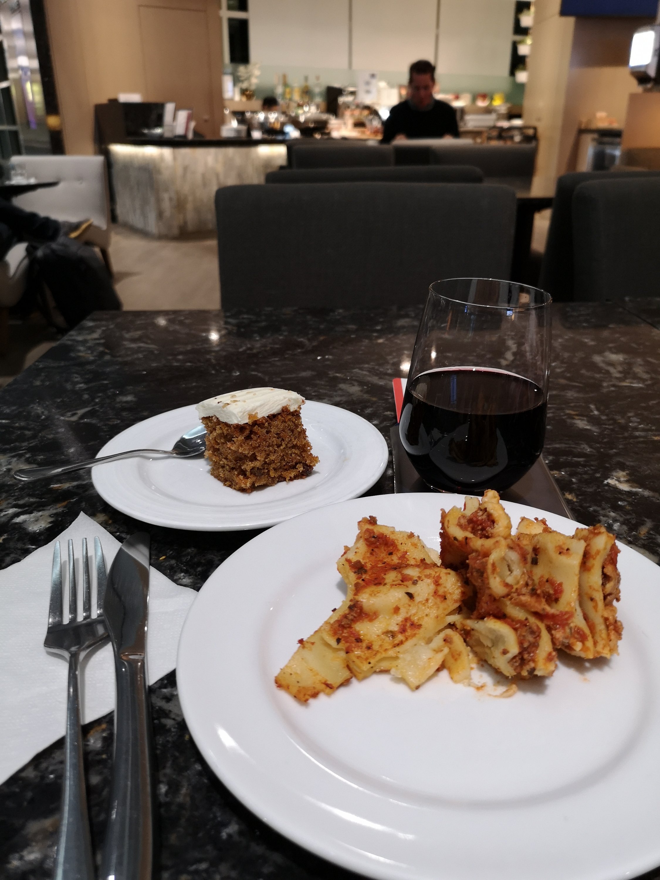I enter using my Priority Pass and easily find a table where I place my hand luggage down and go to the counter to choose a small plate of lasagne, with a glass of red wine followed by a small chocolate mousse and tiramisu cake.