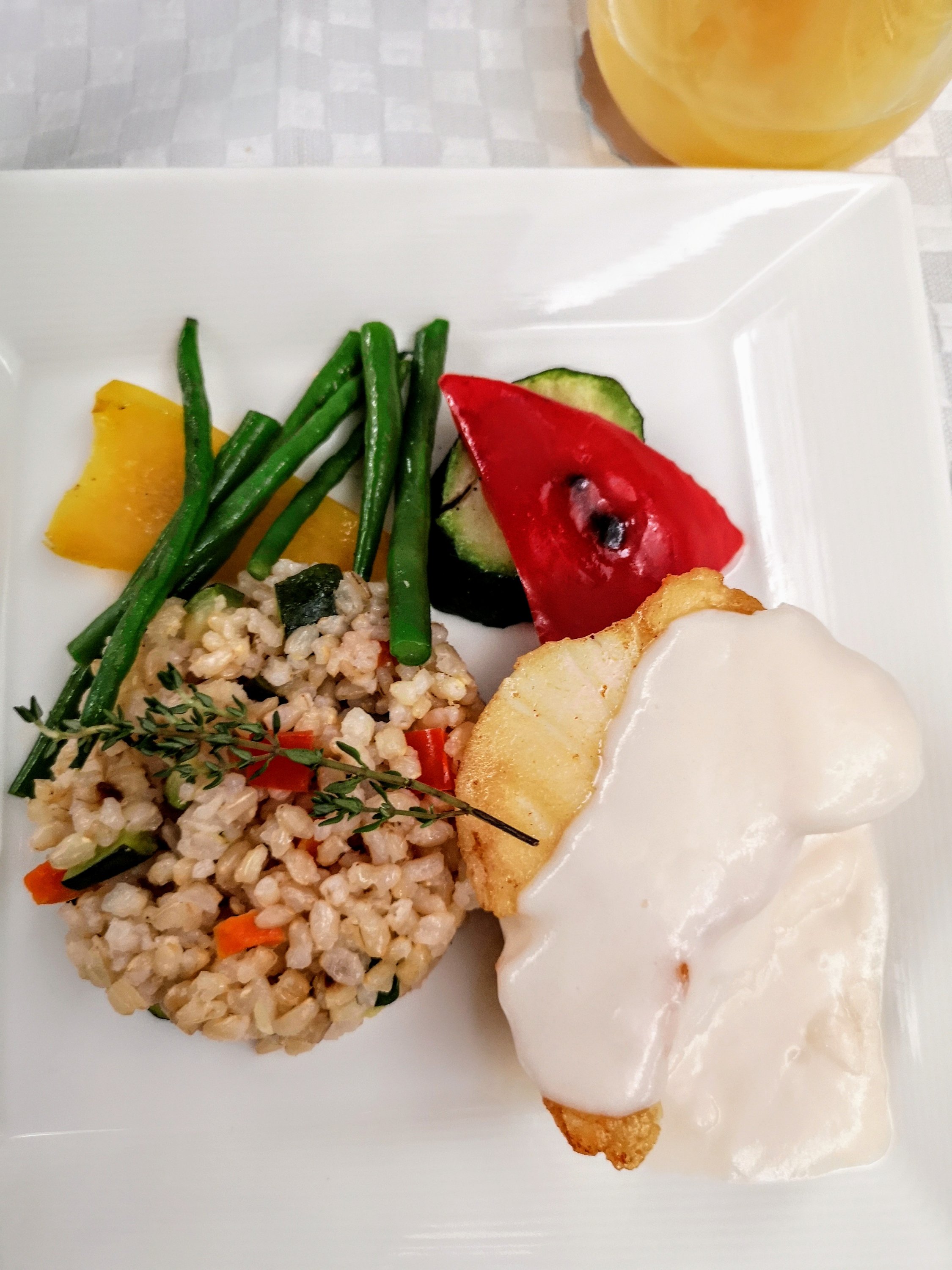 For my main I choose the Pan Seared Sea Bass with Lemon Cream Sauce which comes with assorted vegetables and brown rice. This is preceeded by a prelude of Foie Gras on Paris Toast and Boursin Cheese Tartlet with Sundried Tomatoes, and an Hors D’oeurve of Balik Salmon and sautéed Scallop with Corn Salsa. I skip the wine choices and instead try a signature cocktail – a ‘Passion Island” with Rum, Cointreau, orange and pineapple juices. A Raspberry Chocolate Fudge Cake and a Baileys ends my 1st meal.