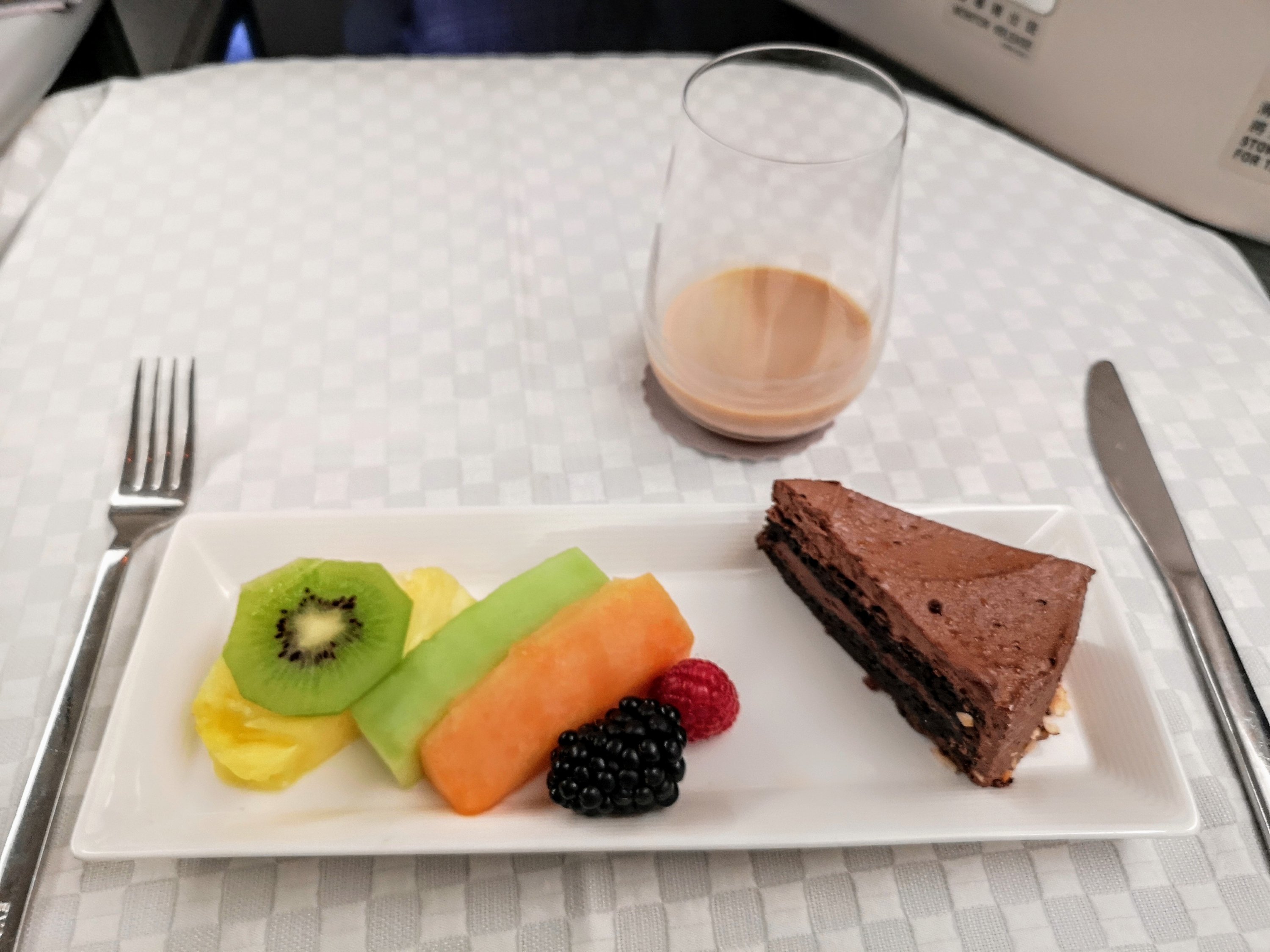 I wake up and finish the movie, order a tea, fall back to sleep, then wake up for breakfast. I go for the Chinese menu and it is quite good consisting of congee and condiments, followed by a fruit plate. During breakfast I watch a Ron Howard documentary on Pavarotti. It is fantastic.