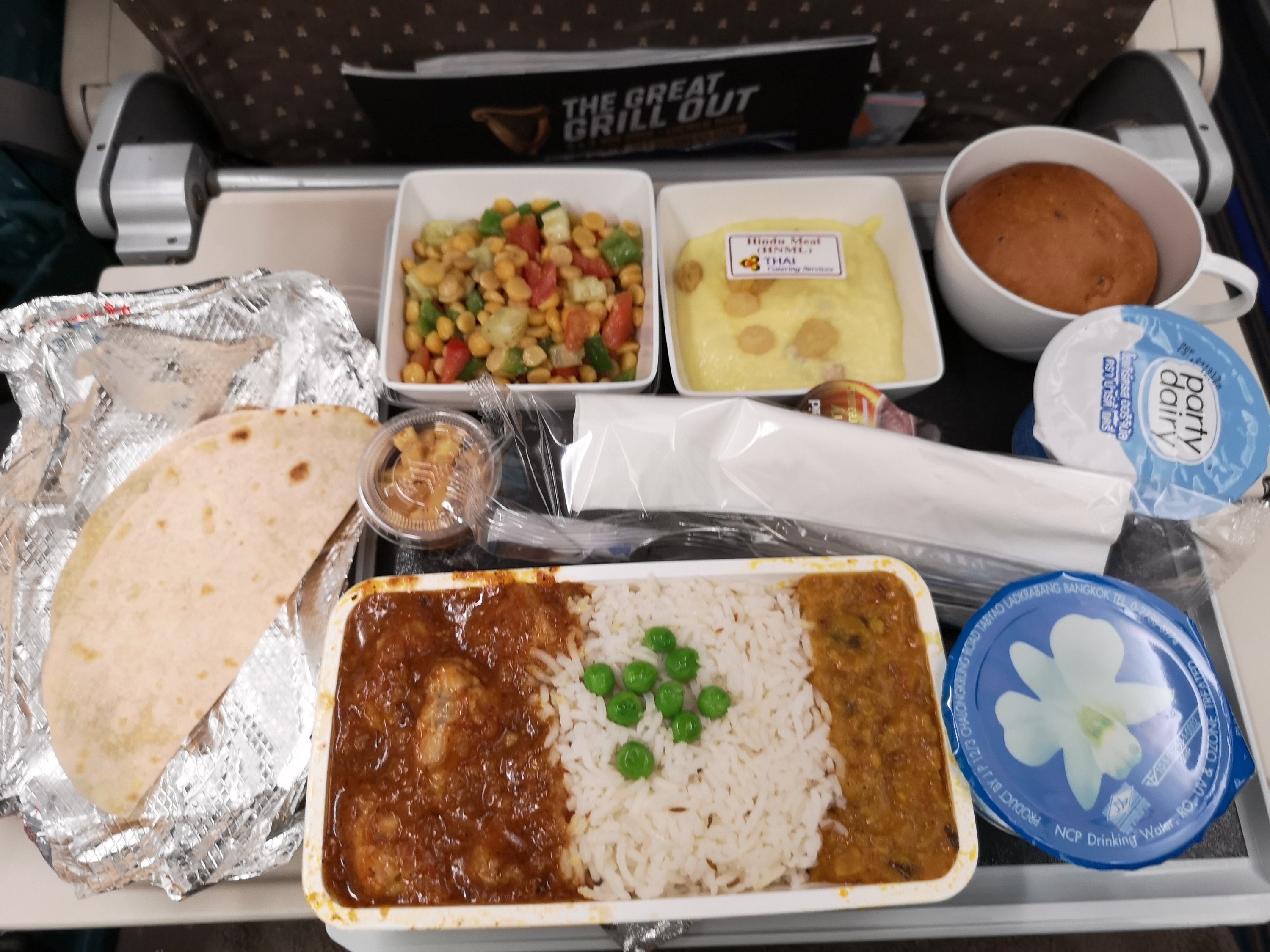 Upon entering the cabin and taking our seats, we are offered a warm wet towel and our pre-ordered meal confirmation. This evening I have chosen ‘Hindu Non-Vegetarian’. It turns out to be not very good – too salty and the flatbread too hard. The cabin is also too cold (I am feeling themes of ‘extreme’ on this flight 😳) and ask the flight attendant for a blanket. After 5 minutes nothing appears so I ask another attendant and finally it arrives.