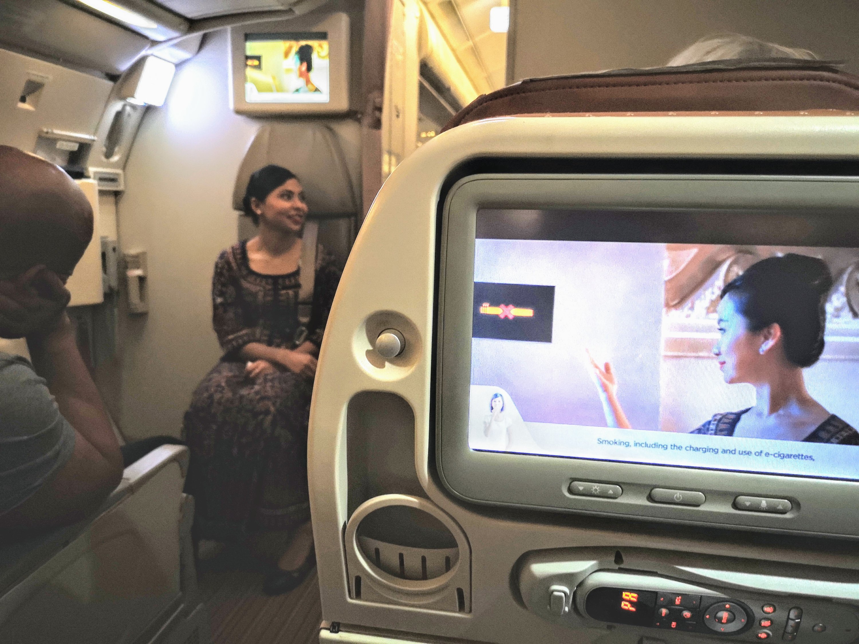 I am sitting in aisle seat 42D on this Airbus A330-300 Singapore Airlines flight bound back home to Singapore. The seat and AV facilities are slightly outdated compared to the flight going over, but I have an empty seat next to me on this relatively full cabin so no complaints.