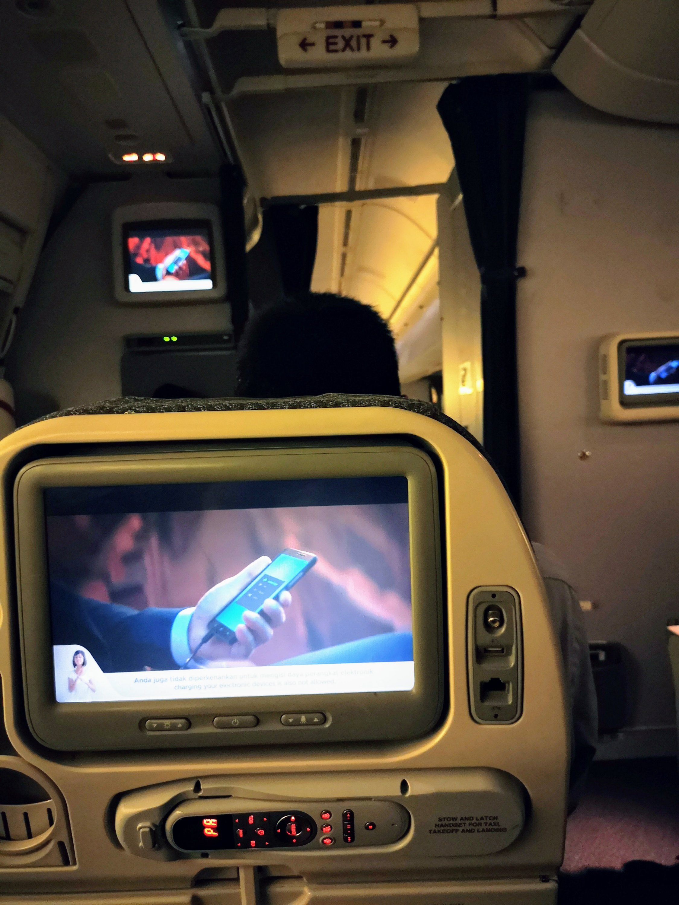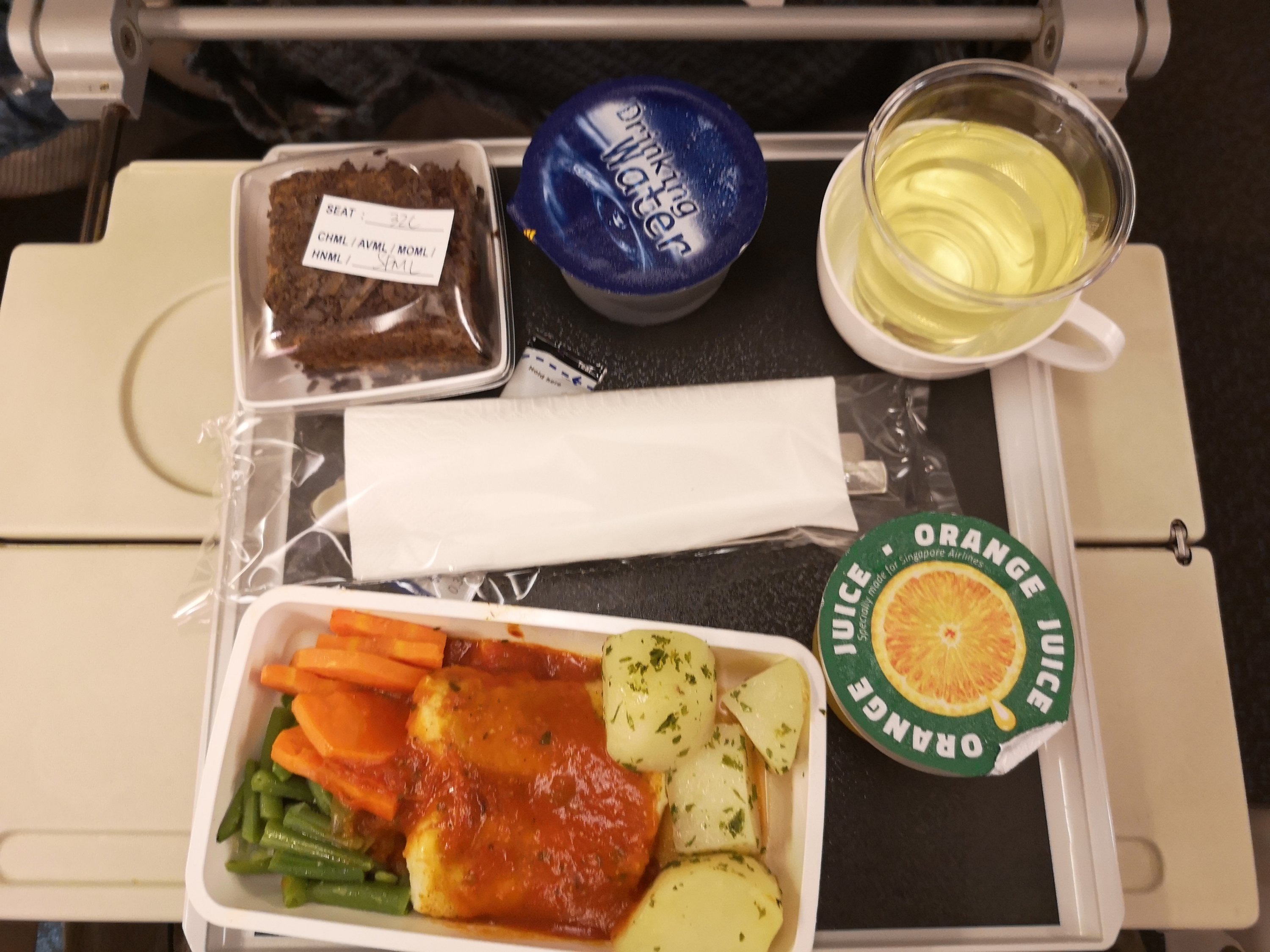 On this return leg to Singapore I am sitting in exit seat 32C on a slightly more modern Boeing 777-300. More modern due to the larger screen and charging availability. Prior to take-off we are offered wet towels and my pre-ordered Seafood meal is confirmed (I request it is brought with a glass of white wine).