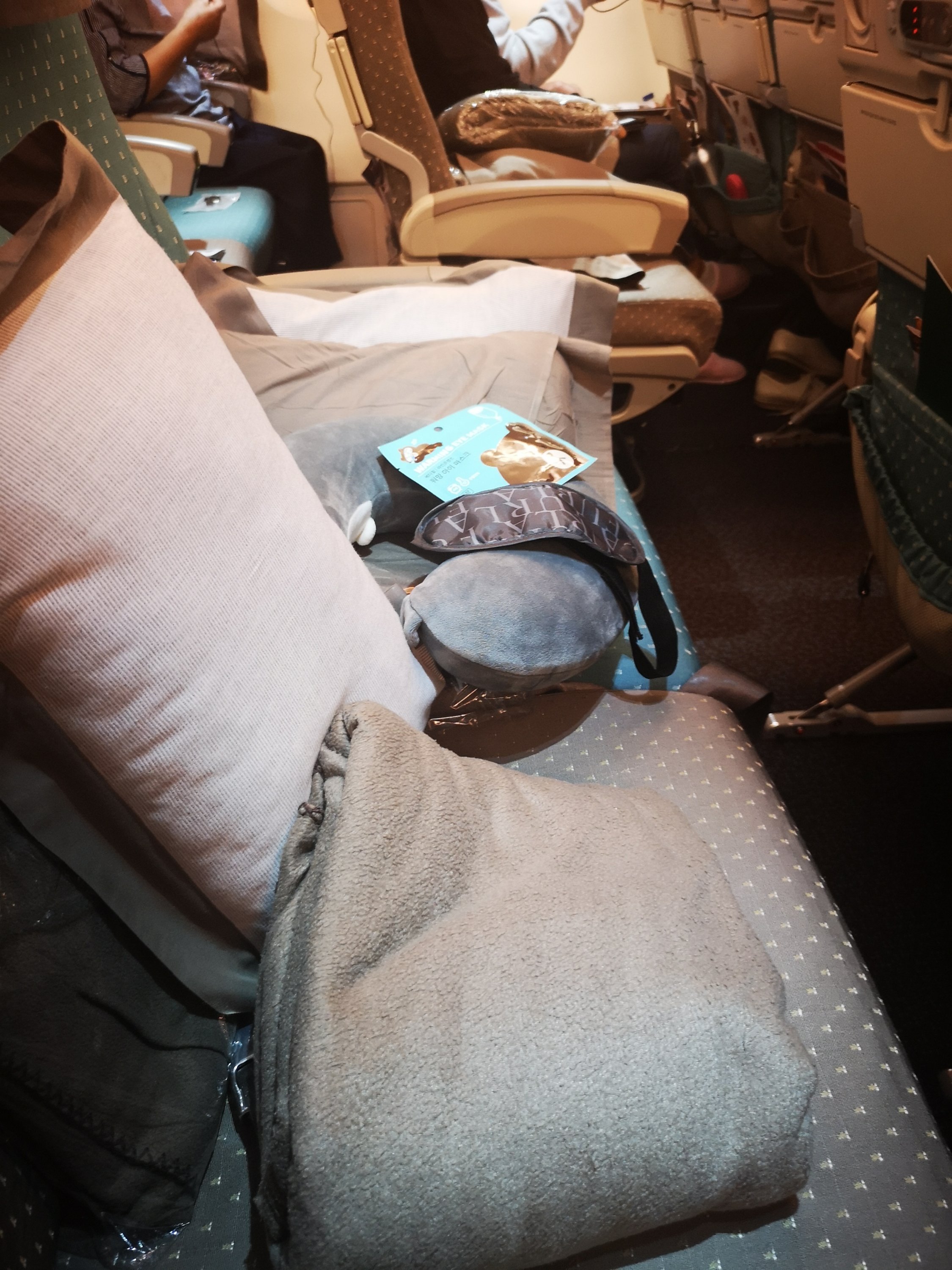 I am sitting in seat(s) 64 D-G on this Singapore Airlines Airbus A330-300 flight bound for Sydney. Yes – a whole row to myself! For a midnight ‘red-eye’ flight, I couldn’t be luckier. I feel. sorry for those people that paid an extra SG90 for an ‘extra leg-room’ seat. I got a bed for free.