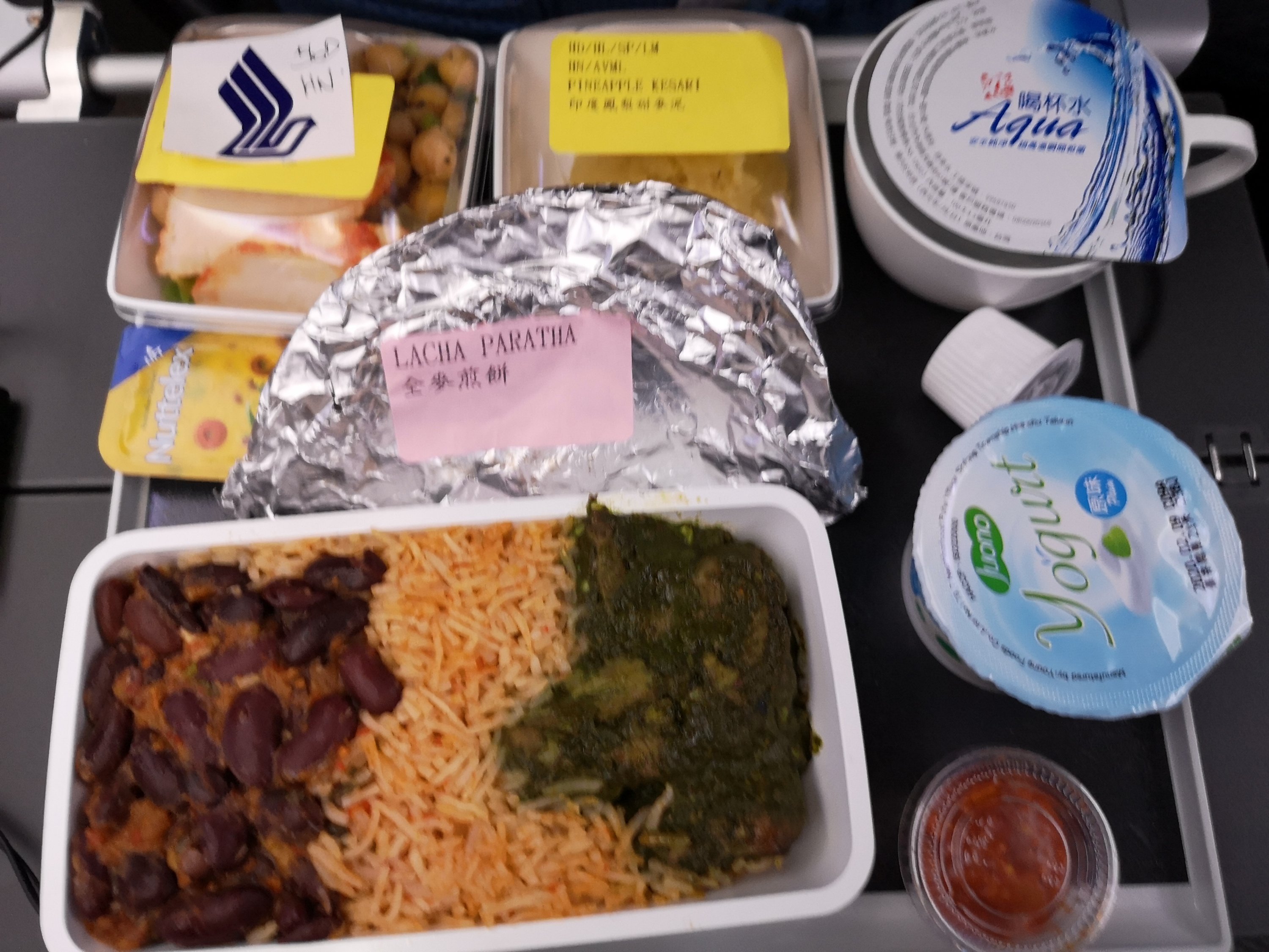 I have pre-ordered a Non-Vegetarian Hindu Meal as the standard meal coming over was awful. This meal though, is excellent. Lamb Saag (with spinach) and kidney bean curry with rice and a chapati, yogurt, a chicken and chickpea salad, and a pineapple dessert. I enjoy this with a glass of red wine.