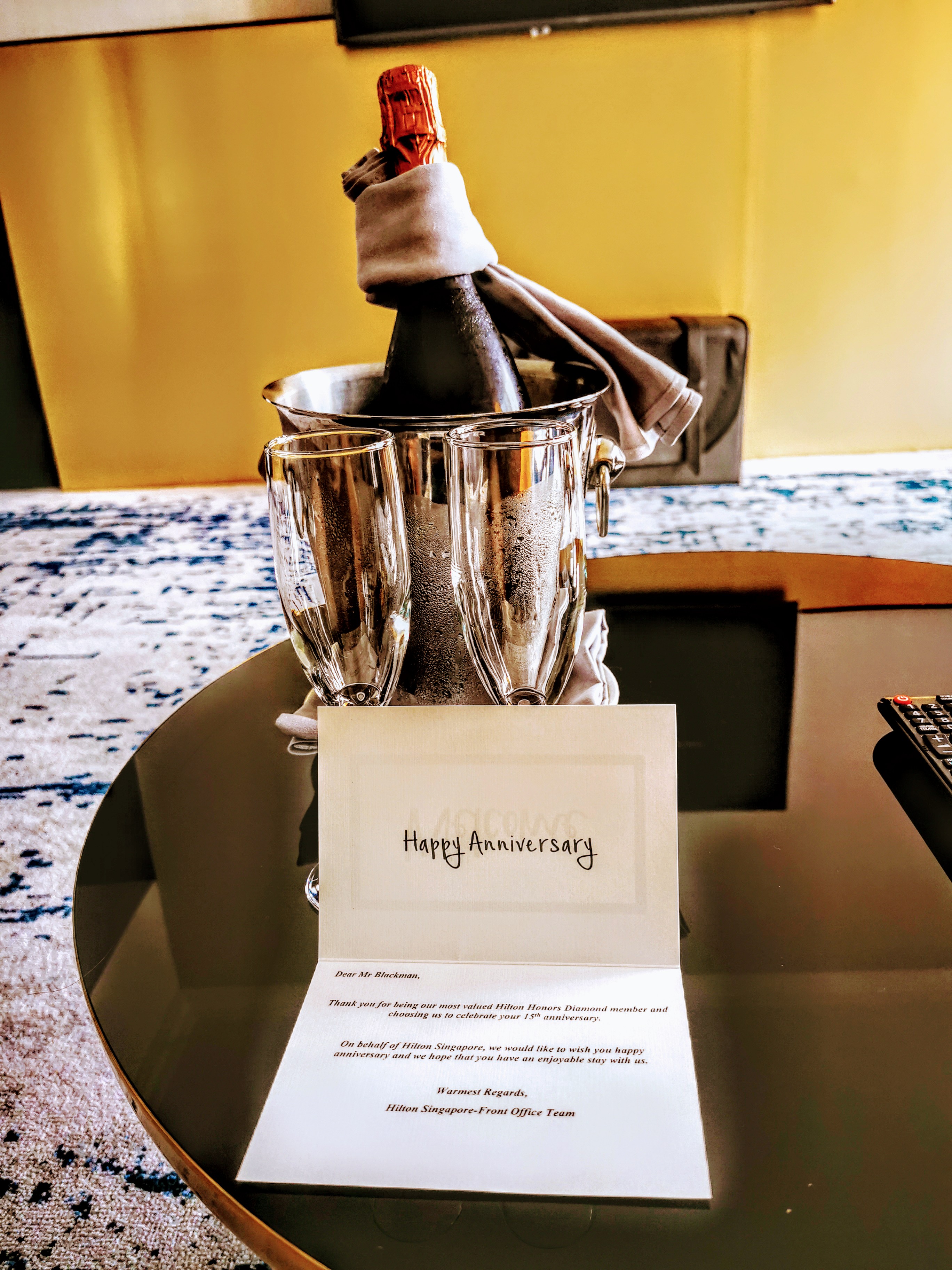 The room was large, but bland. Standard King bed, with separate living area, around 70 sqm. The hotel presented a bottle of Sparkling and a congratulatory card for our anniversary, which was a nice touch. Other than that there was not other welcome amenity for Diamond members, which I suppose again is something of the past…….