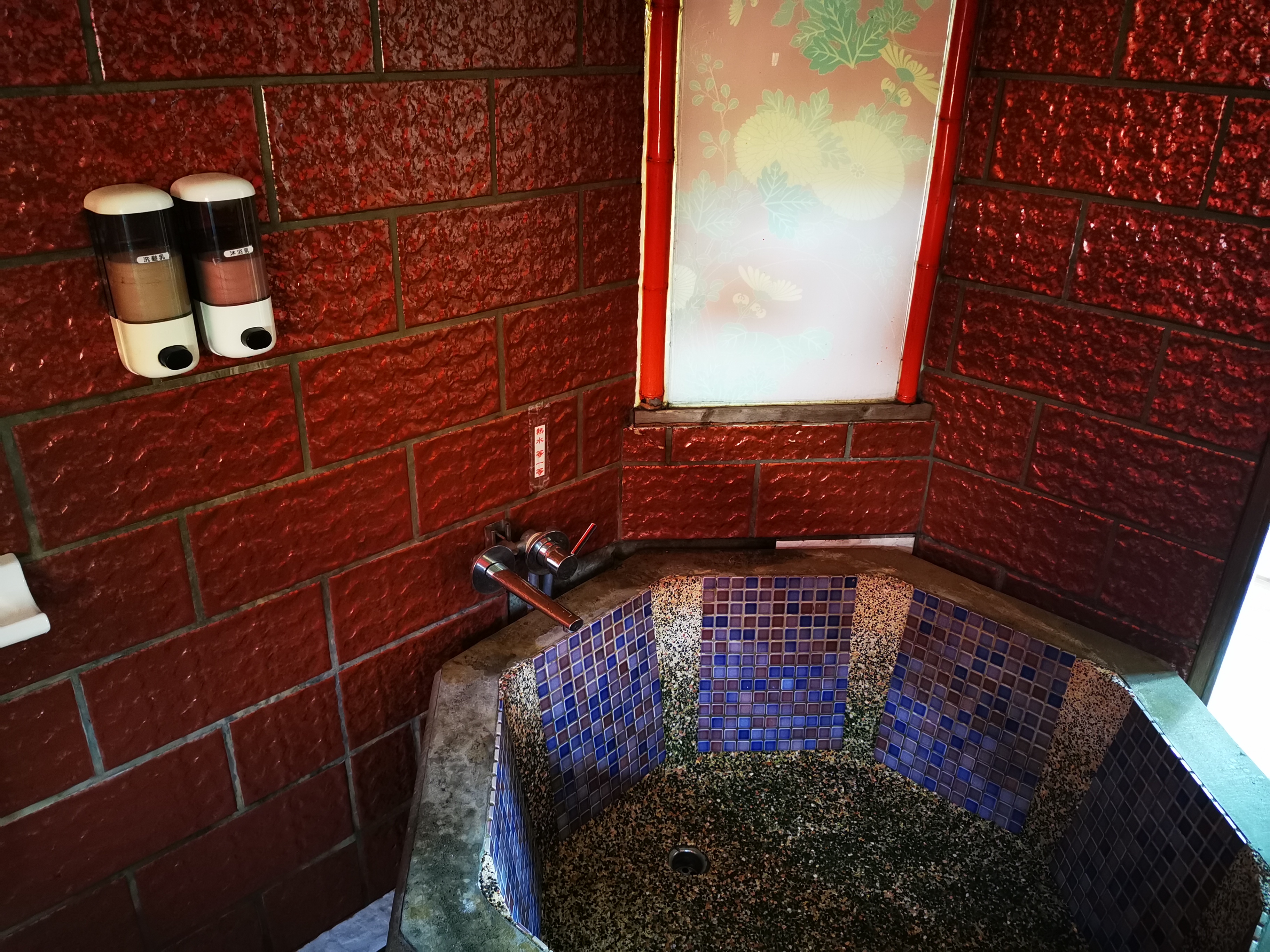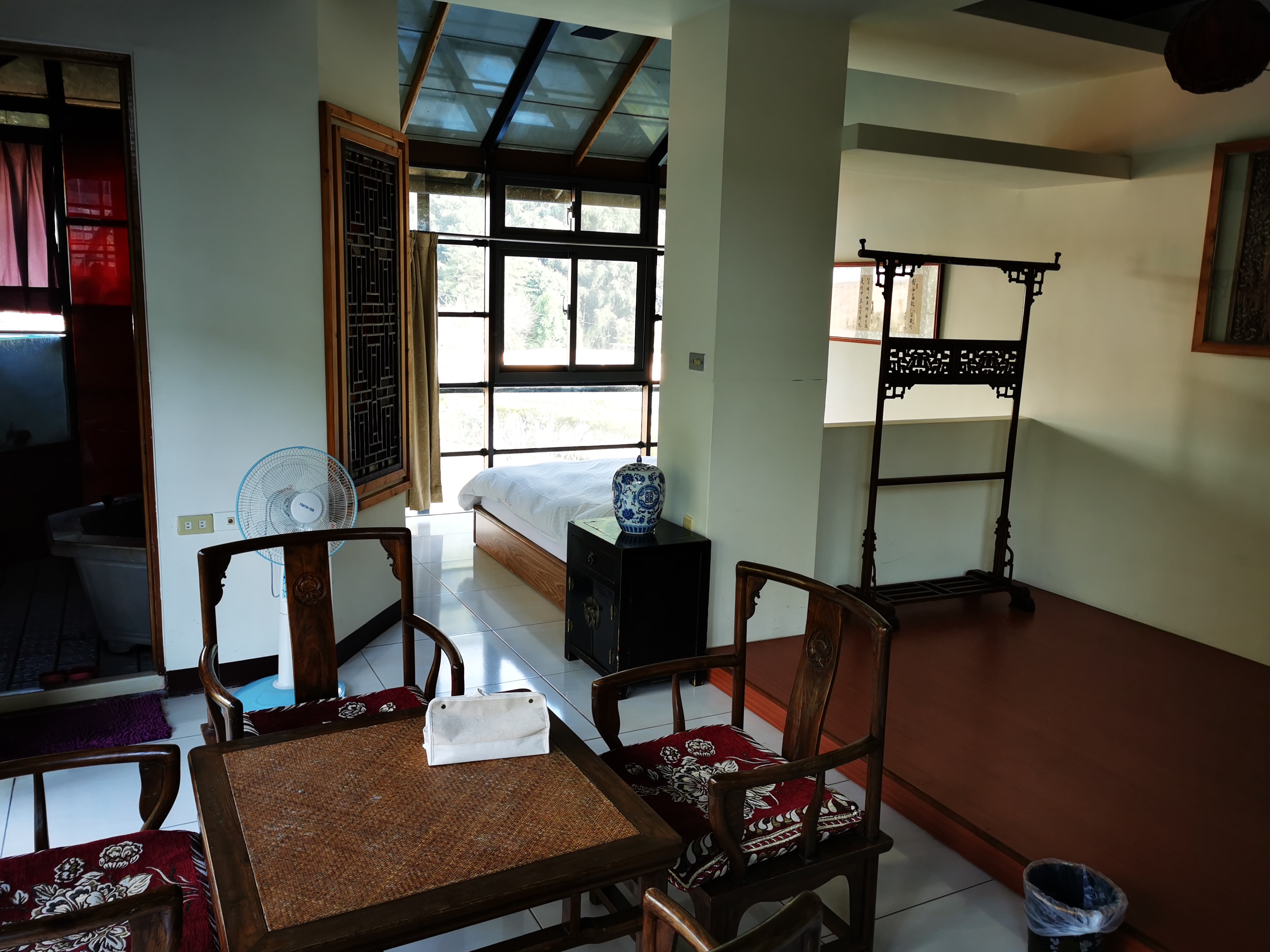 Our double room is huge, with traditional Taiwanese table-setting, alcove for yoga or meditation, and pebble bathroom with views of the mountains.