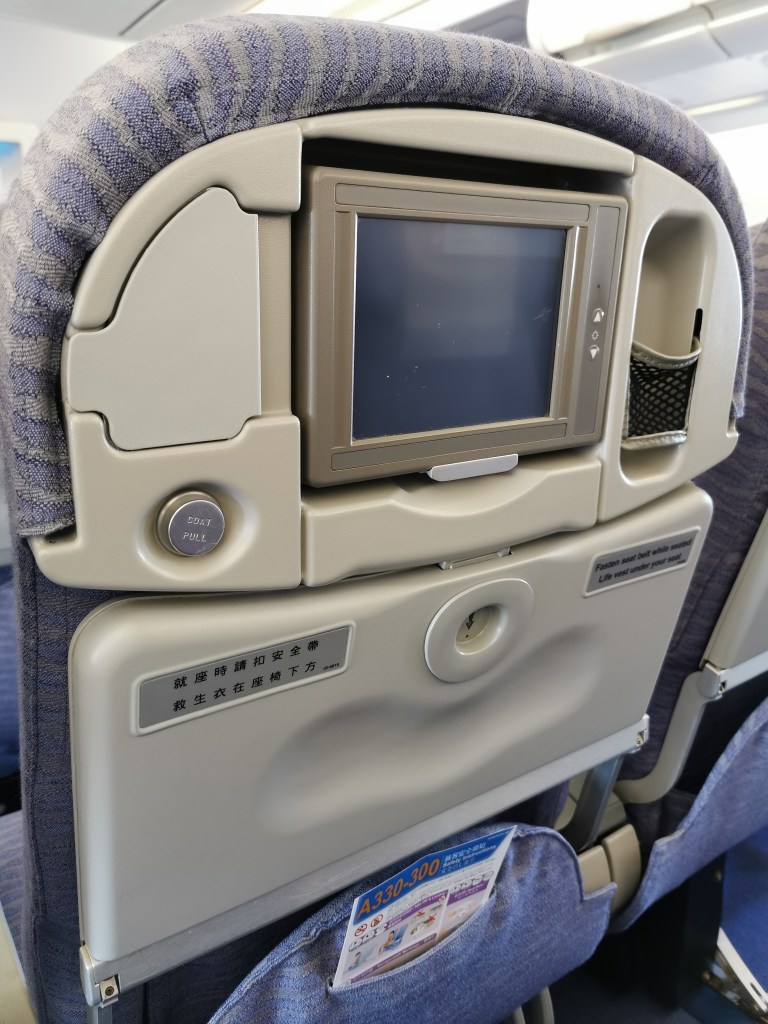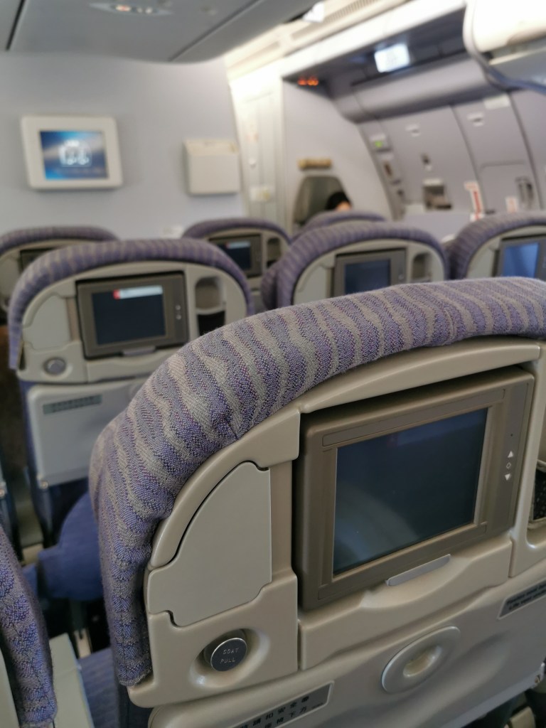 I am pretty sure they are using this older model aircraft as there are only 28 passengers in the whole of Economy. For example, the AV system is from the early 2000s – tiny little boxes, and no power chargers. My partner is up ahead flying business class as it was only an extra 15K Skywards miles and we needed the extra baggage. My ticjet my not upgradeable. The trade-off was my empty row to stretch out and sleep, which I did.