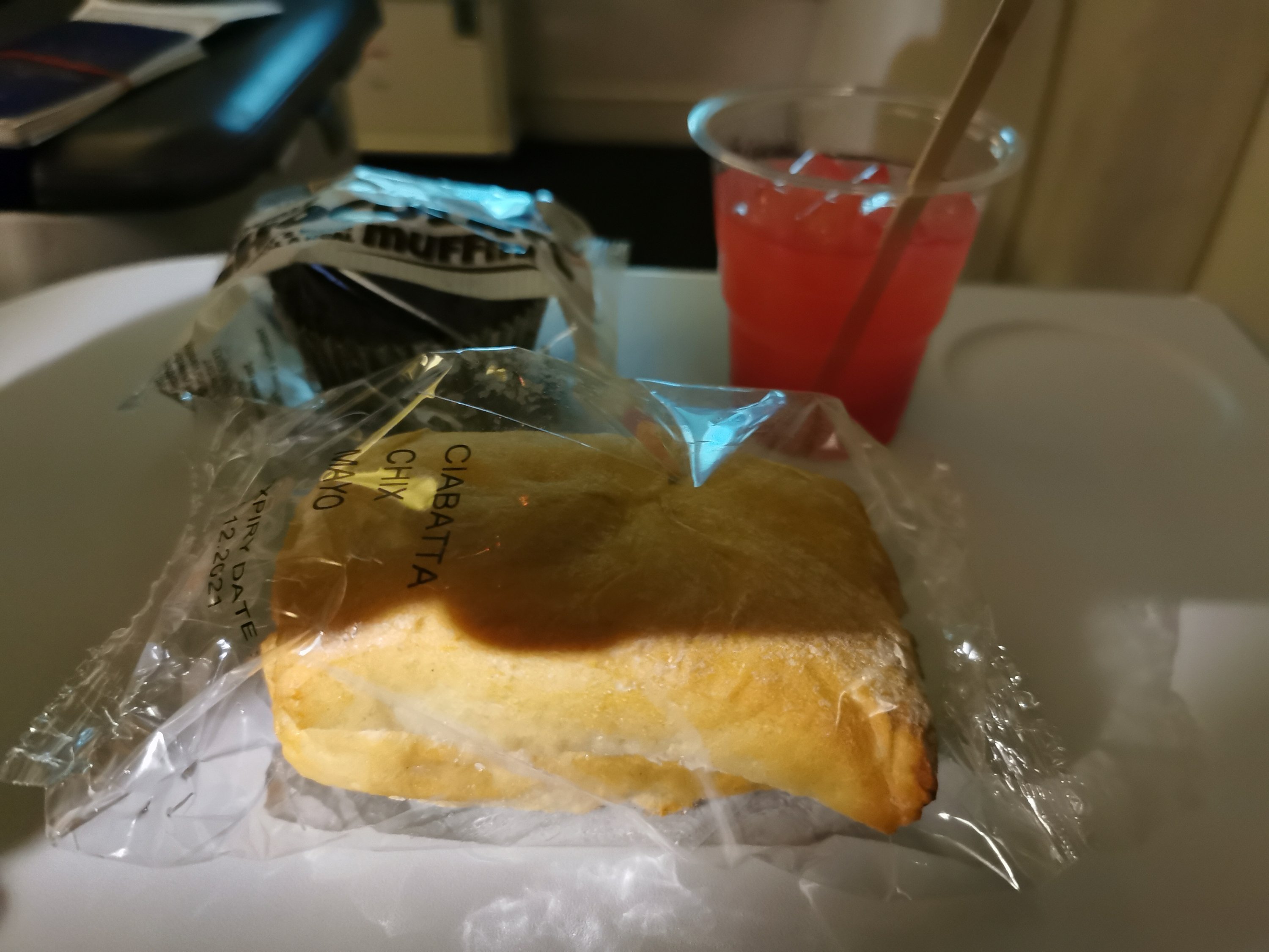 I manage to sleep for a couple of hours, and when I wake up, am feeling peckish, so ask for a Chicken and Mayo Cibatta, brownie (which turns out to be a muffin) and a Singapore Sling.