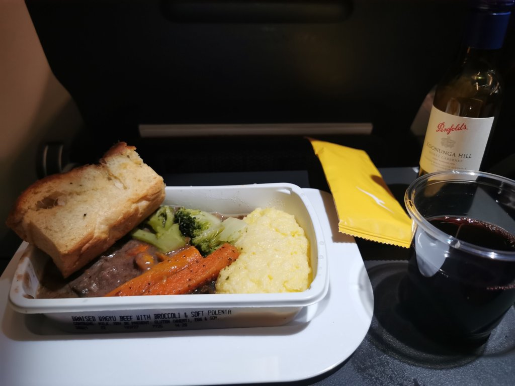 After an on-time take-off, service begins with Aperitifs, and I have a vodka and ginger ale with some mixed nuts. Shortly after, we’ll into my first movie, the lunch service starts and I choose the Braised wagyu beef with broccoli, carrots and soft polenta – delicious, and complement it with a glass of Australian Barossa Valley Shiraz. An old-time Splice ice-cream finishes the meal.