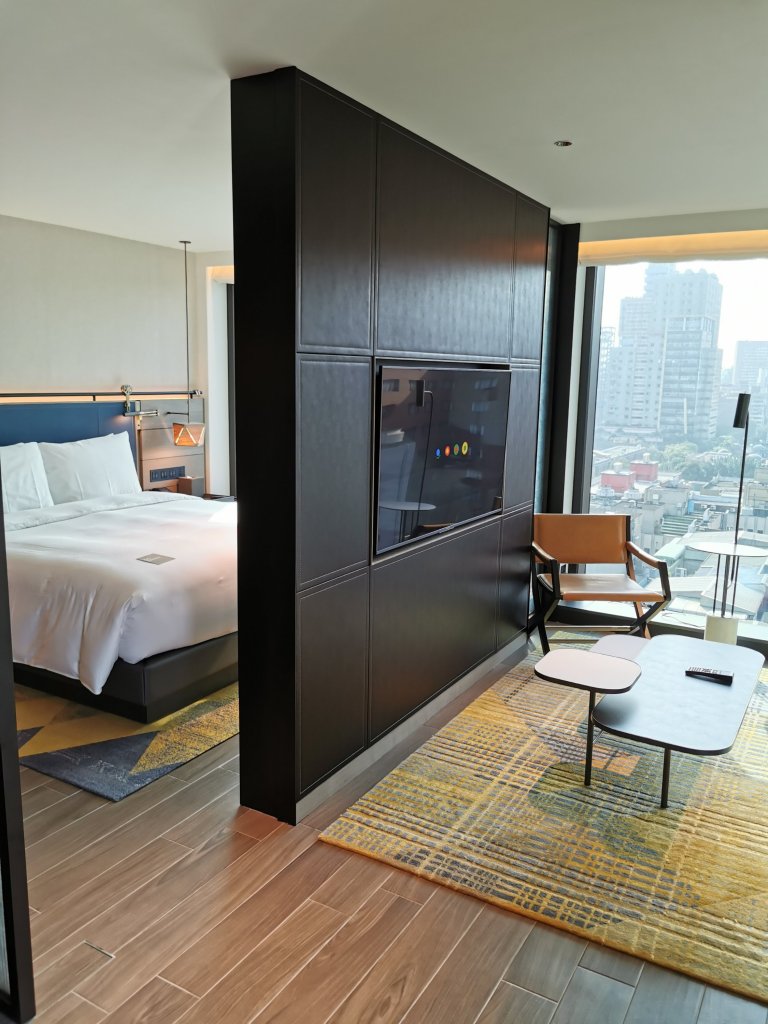 My booked standard room using 29K Hhonors points is upgraded to a King Times Suite – about 60 Square metres and architecturally interesting – wooden and concrete with huge windows, 2 TVs, automated blinds, seperate living space, and work area.