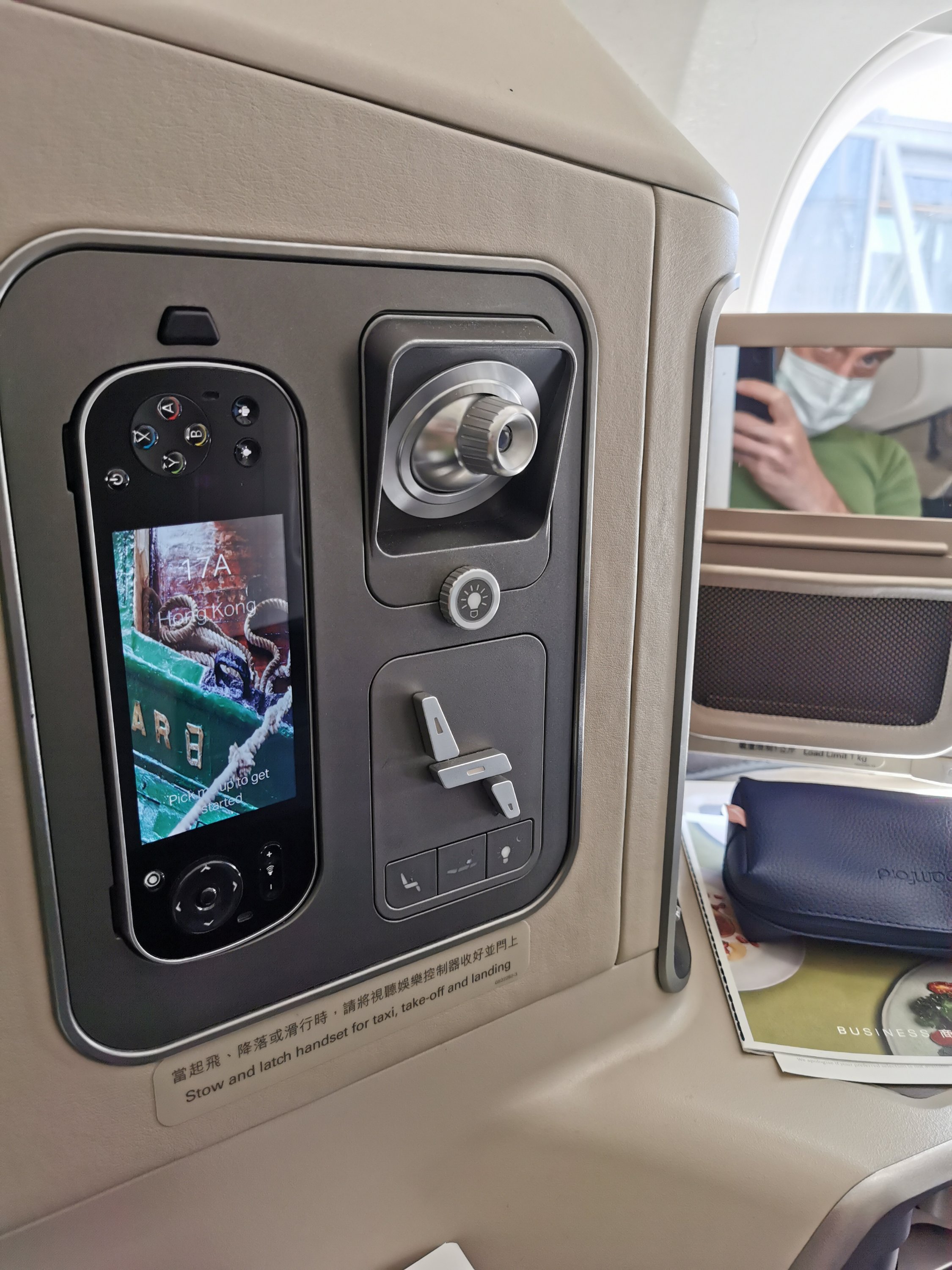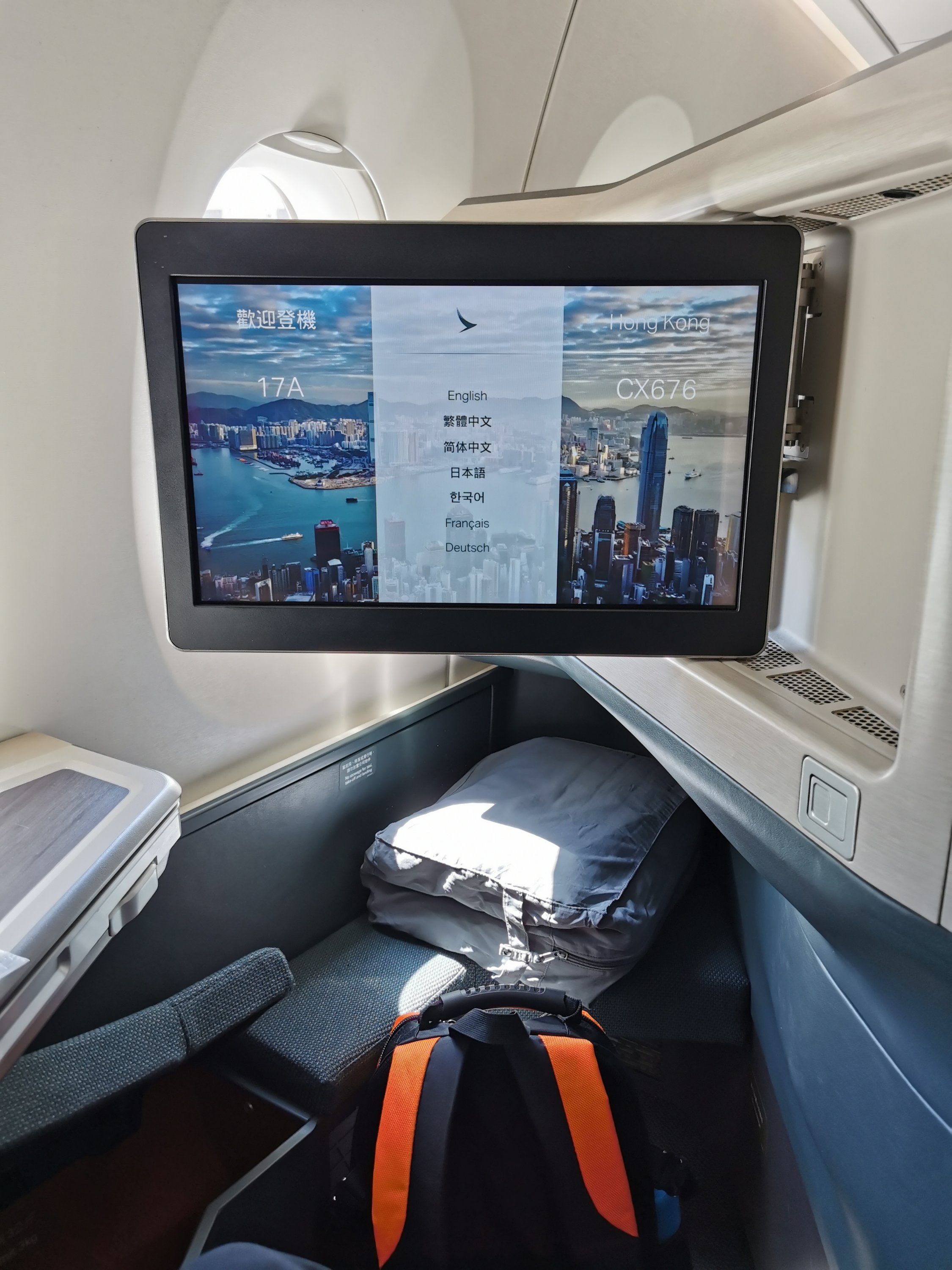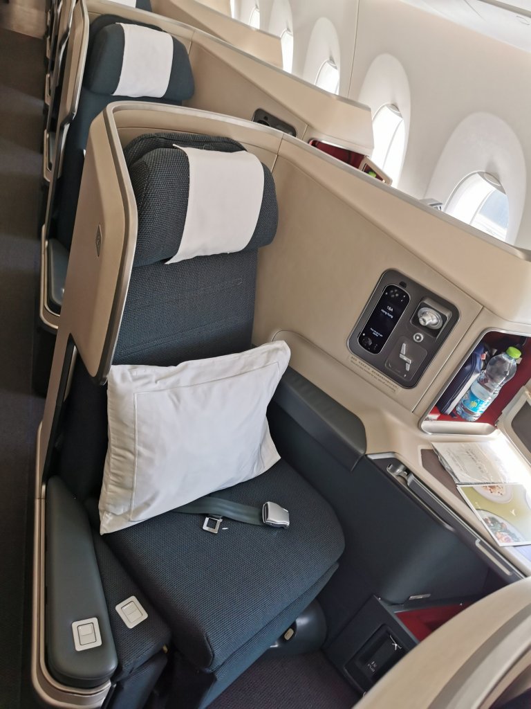 I am sitting in Business Class seat 17A on this Cathay Pacific Airbus A350-1000 aircraft bound for Hong Kong.