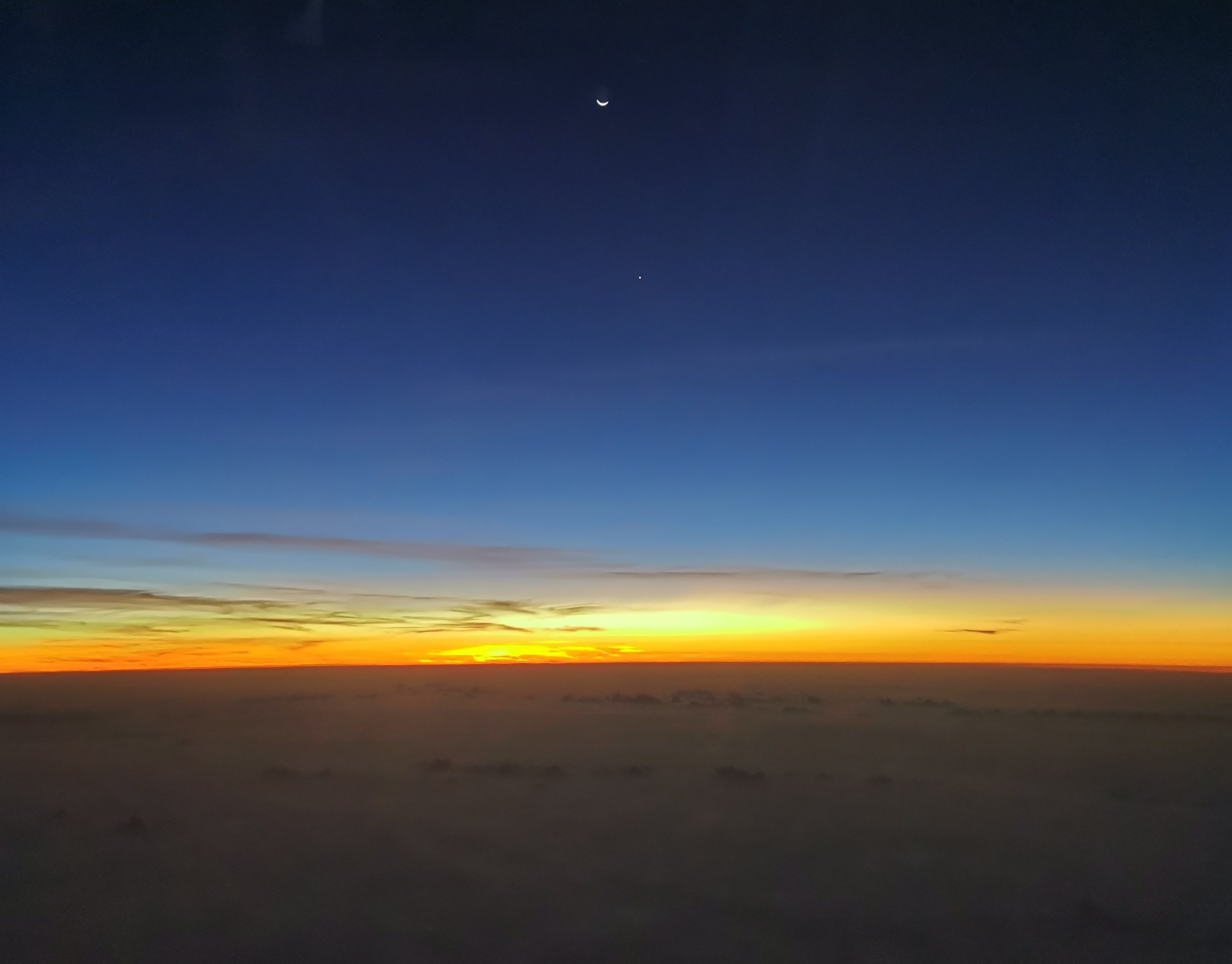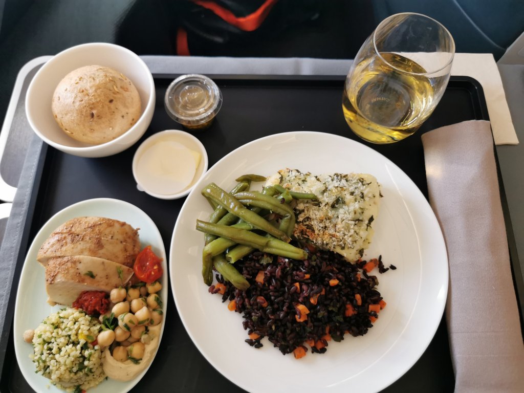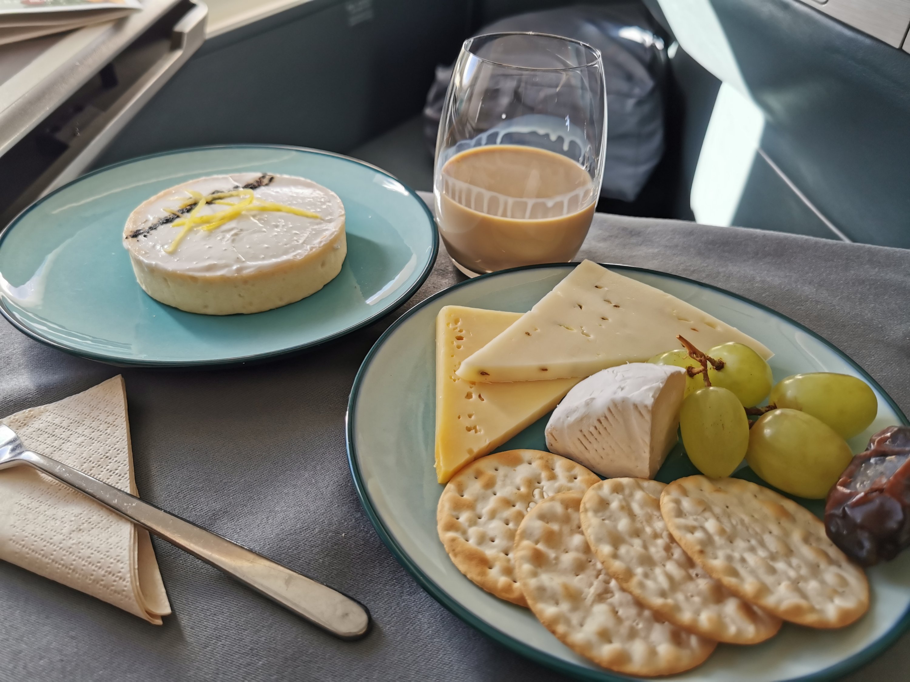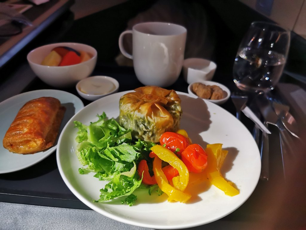I had ordered the ‘Wellbeing’ breakfast but the flight attendant made a mistake and by the time he came to me there were no more left, so I opted for the ‘Light’ breakfast which was still quite heavy. This is paired with a glorious sunrise out the window.