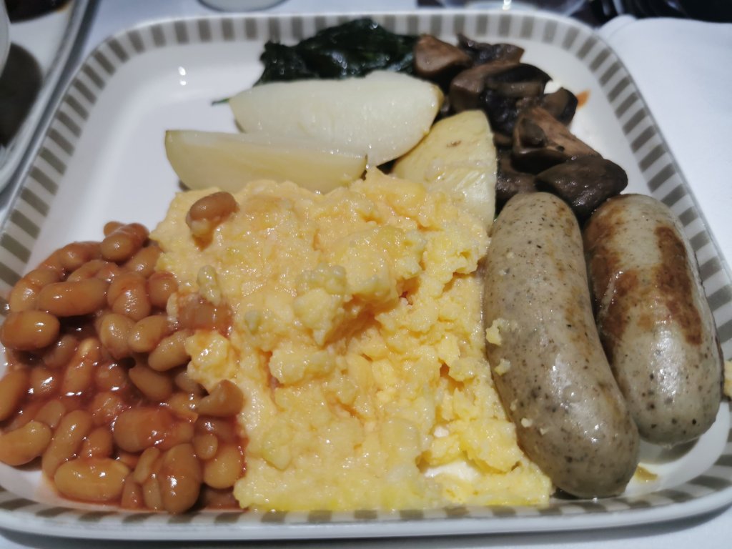 I wake up to the sound of breakfast being served and I choose the full Western breakfast which includes scrambled eggs, baked beans, sausage, potatoes, a selection of breads, fruit, and coffee. It is a brisk service as we are landing in an hour or so.