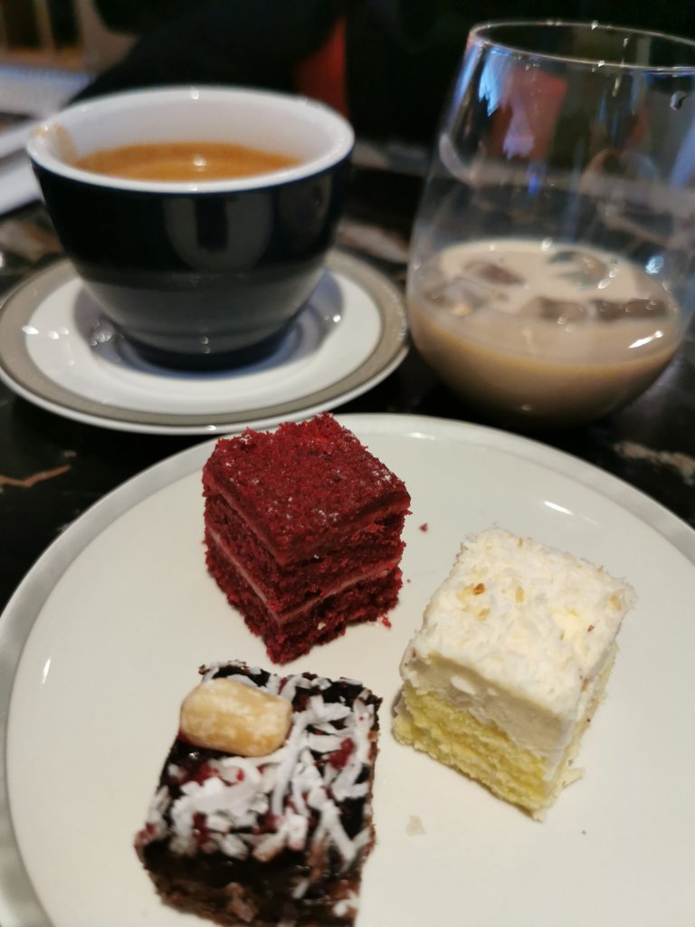 I am not hungry since I have just had lunch but still do a quick round of the buffet and grab some roasted chicken and seafood rice and salad, and a glass of Munn Champagne (which I don’t finish), instead ordering a flat white with some bite-sized cakes.
