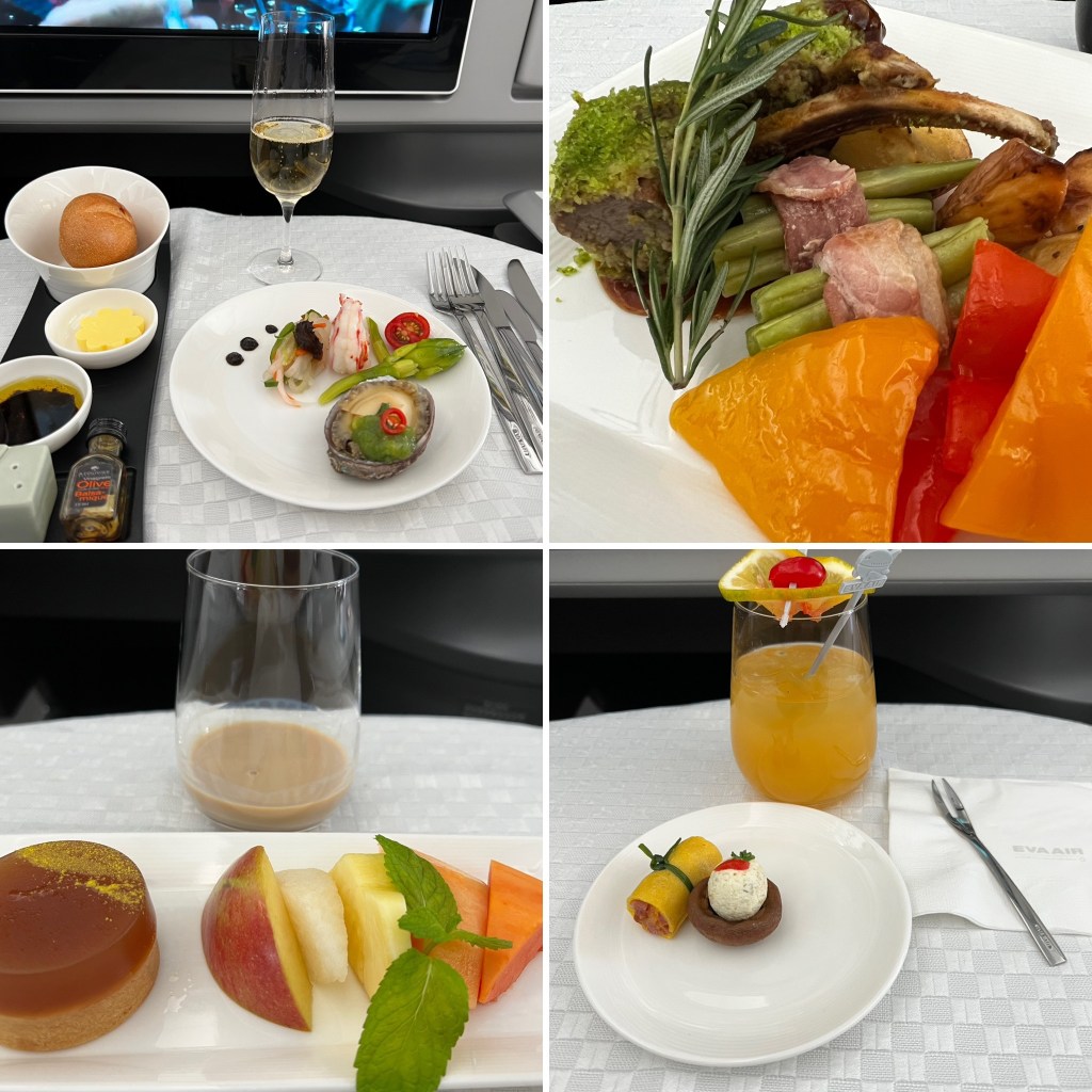 About an hour into the flight lunch is served. It starts with a passionfruit cocktail and then the Eva Air business class Sky Gourmet service begins. The ‘Prelude’ is Cream Cheese Stuffed Mushroom and Egg Crepe roll with Smoked Duck and Apricot Compote, served with bread and condiments. It’s quite good. I have pre-ordered a Rack of Lamb which is excellent, and have this with a glass of 2014 Spanish Red wine. Dessert is delicious – Fruit served with Apricot Tart and Oriental Beauty Tea Jelly. A Baileys Irish Cream finished it off.