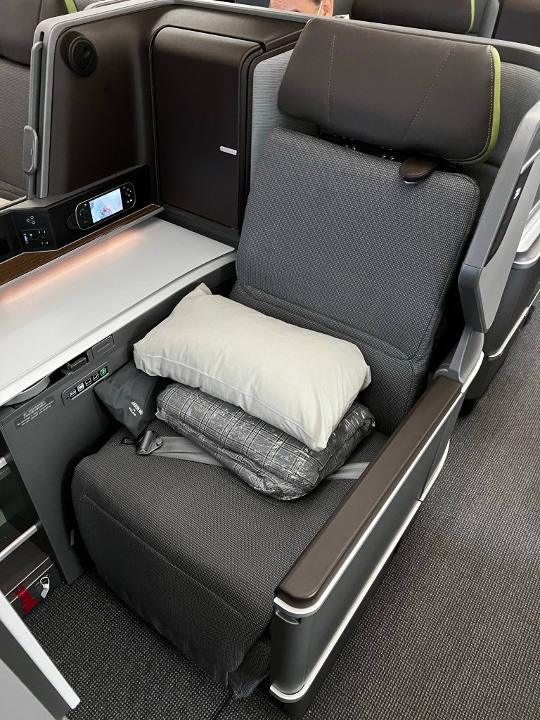 Upon sitting in my seat I am greeted by a flight attendant who confirms my pre-ordered meals, and takes my pre-departure drink menu (a green tea smoothie of sorts) which is quite nice.