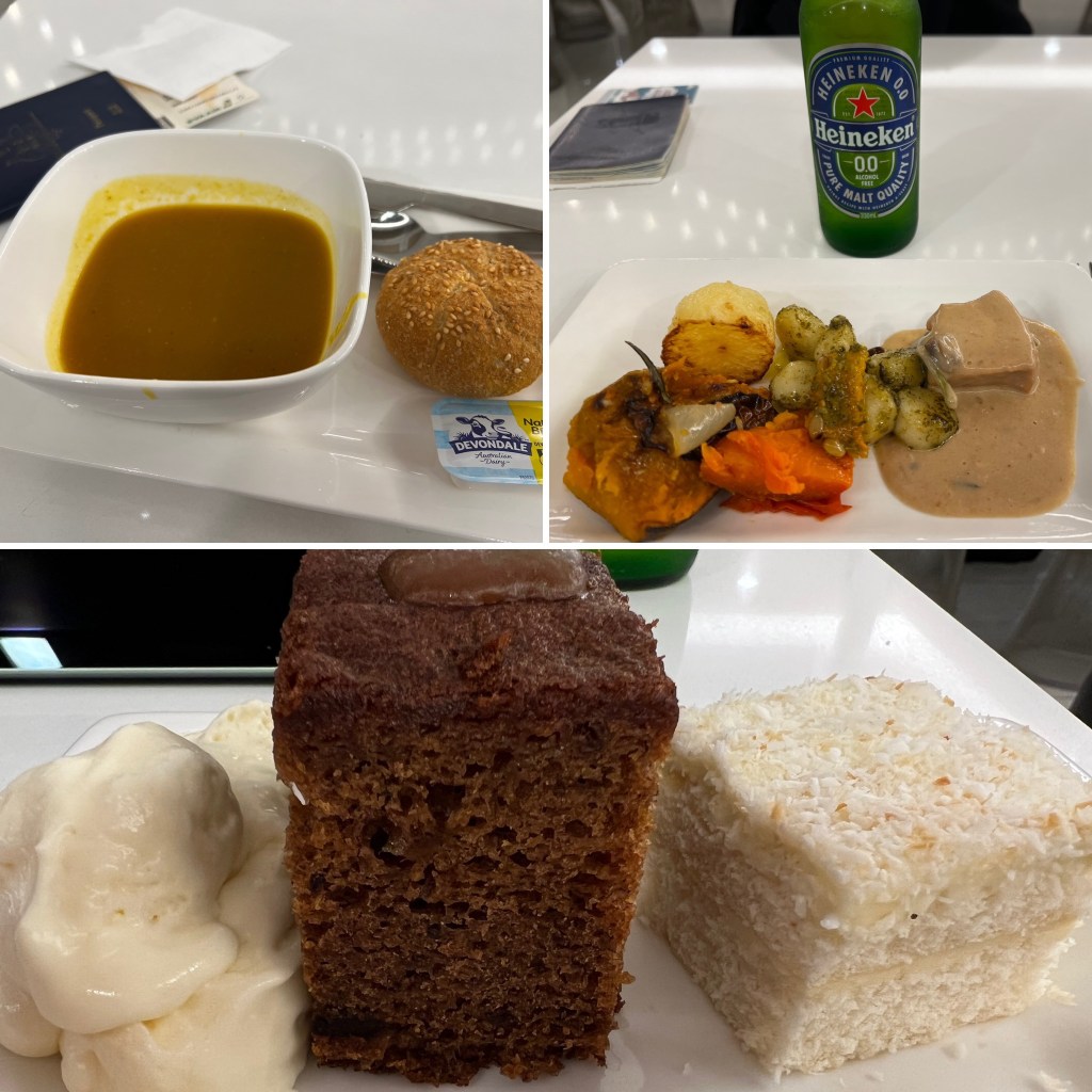 Food wise I have the pumpkin spice soup (a bit salty), Cajun chicken in a creamy sauce (yum) and baked verges. To finish, the staff offer to heat up a scone which I have with jam and clotted cream, and a sliver of sticky date pudding and coconut cream cake. Iβm full. And tired.