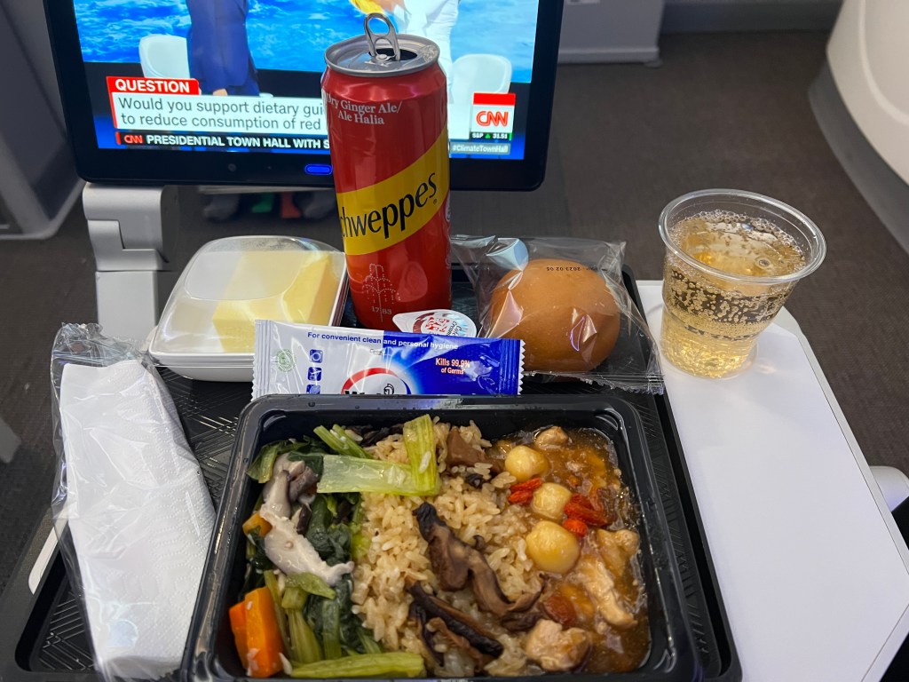 Shortly after take off the drink service begins and I regretfully choose a Singapore Sling – regrettable as I haven’t had a drink for 5 weeks. This is served with a small packet of nuts.
