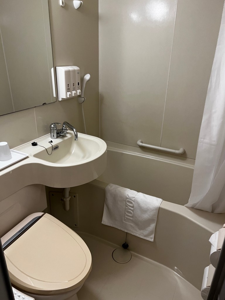 It is totally functional- everything you could possibly need is here – mini fridge, window that opens (slightly), bathtub,/shower and strong hot water comes out immediately, tv, working desk, humidifier, double bed. It’s perfect!
