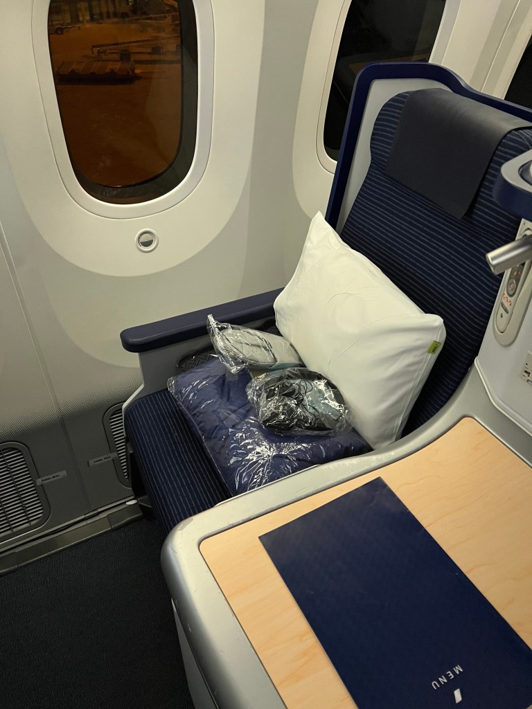 Upon boarding, I am shown to my seat which at first glance looks quite good, a herringbone shaped seat facing the window with an amenity kit, blanket (duvet), mattress, and headphones (all wrapped in plastic). But I soon realize the hard product doesn’t compare with other airlines such as SQ and Eva air. For example, the amenity kit doesn’t have hand cream or face/body cream, the blanket is small and thin, the headphones are not noise canceling, and the usb charger does not work.
