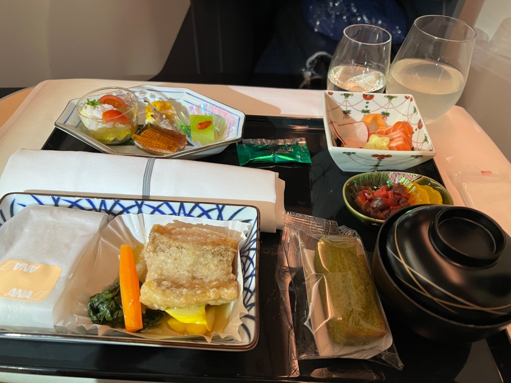 There is a choice of either a Western or Japanese meal – I have ore-ordered the Japanese meal thinking it would be amazing as I am flying a premier Japanese airline, but my recent Japanese meal on Taiwan’s Eva Air was much better. The ice cream for dessert, for example, is served rock hard and I have to wait about 10 mins for it to slightly soften before I can stick a spoon in it.