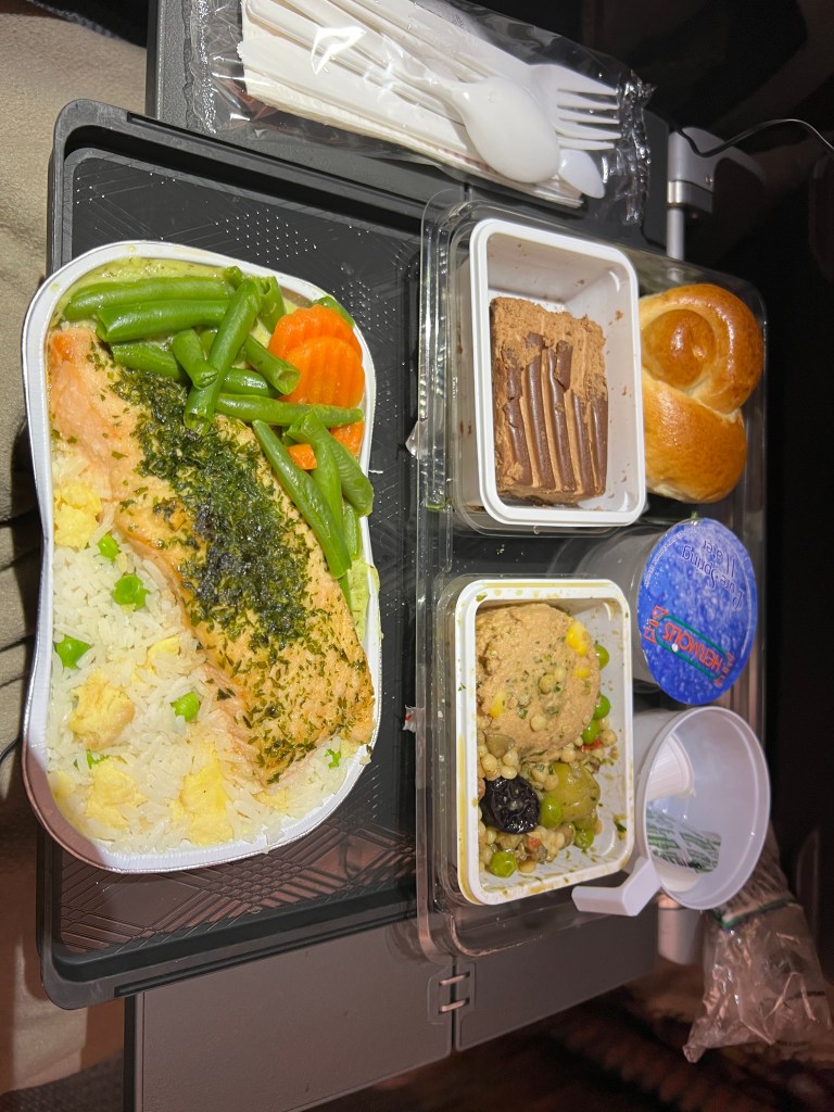 About 30 minutes after take off the meal service begins and I receive my pre-ordered Kosher meal. It is pretty good – a huge piece of salmon with green beans and carrots on a rice pilaf, with a lentil, chickpea and salmon fish cake salad, a soft twist bread roll, and a delicious chocolate mousse cake for dessert. As a bonus I also get the Hagar Daaz ice cream that comes around for the standard meals.