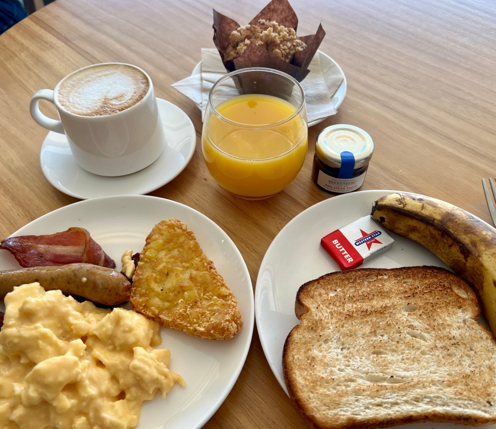 It is huge, and crowded, but I find a small table a seat squashed between a couple of others a pop down my bag before making my way to the buffet. Itโs not overly extensive but the food is delicious. And plentiful. Scrambled eggs, sausages, hash browns, fruit, freshly squeezed juices, and barista-made coffee.