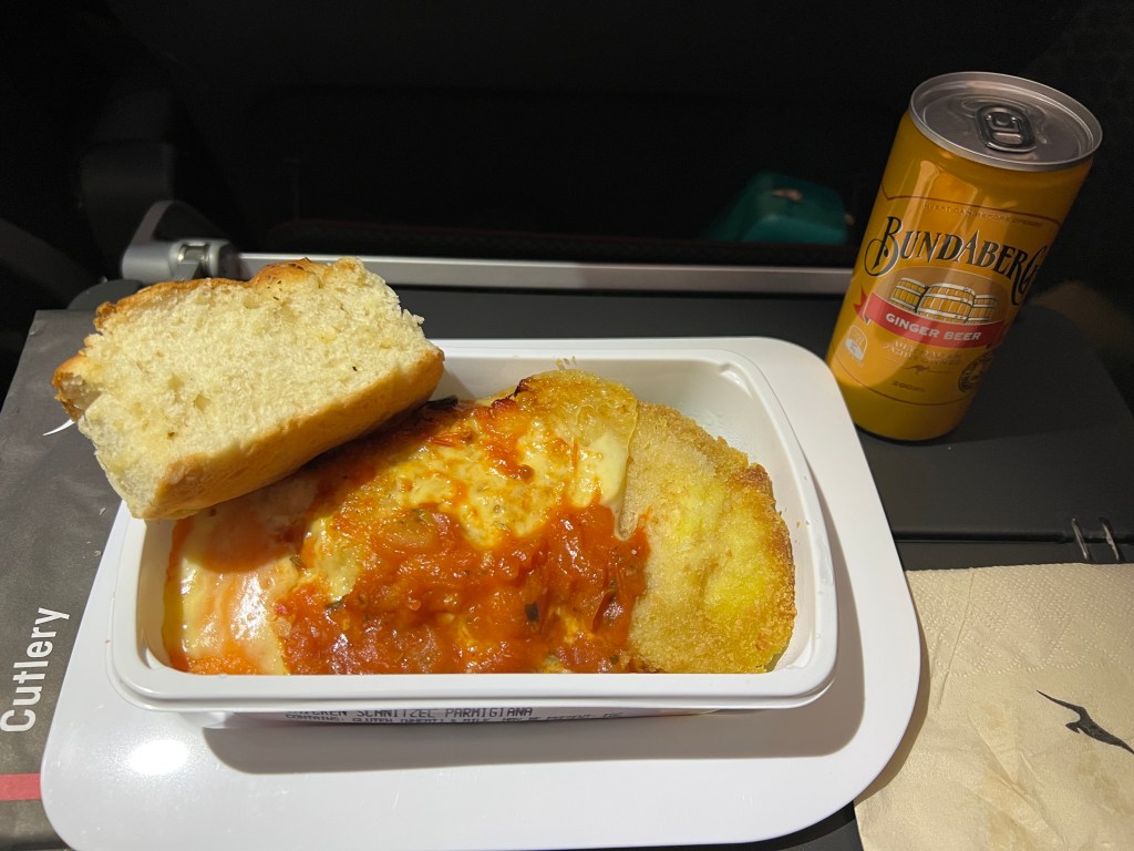 The flight is delayed 2-hours so it is not a great start to the journey – I had been at the airport for 5 hours as a result. Nonetheless once onboard service is ‘assertively friendly’ and begins about 20 mins post-takeoff with a mixed nuts packet and drinks. This is shortly followed by the main meal – of which there are 3 choices, and I go for the chicken schnitzel parmy with mashed sweet potato. It is ok – the veges taste a little bit frozen. This is followed by a chocolate paddle pop ice cream.