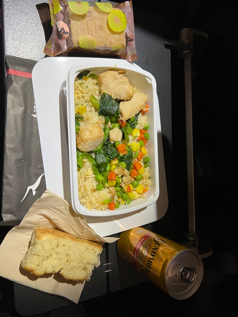 The second meal on this 9.5 hour flight has 2 choices and I go for the chicken fried rice and raspberry blondie. It’s quite bland.