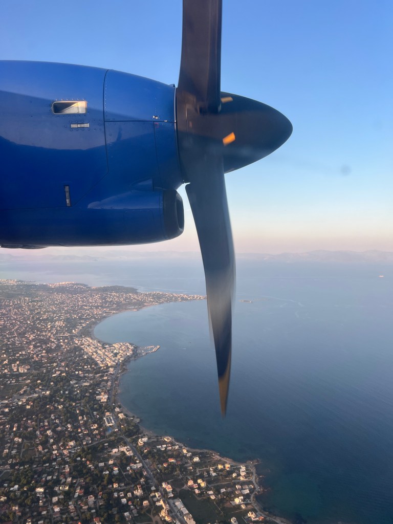I am sitting in seat 5B on this very short 40 min flight from Athens to Chania (Crete). the plane is an AT72-600 propeller plane and I am the only passenger with 2 seats to myself.