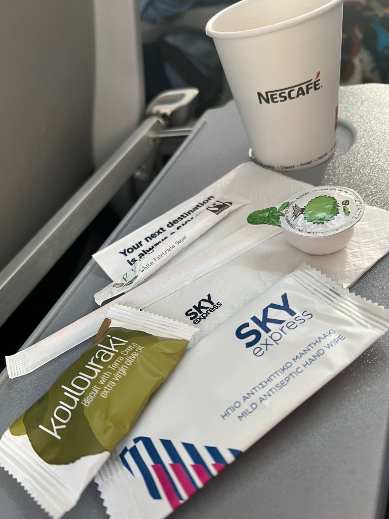 Shortly after taking off (about 45 mins behind schedule due to late arrival) we are served a quick drink and biscuit.