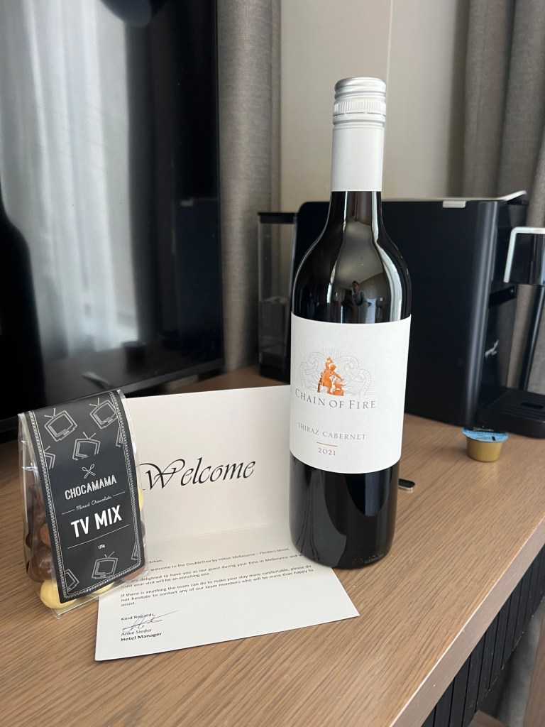 There is a packet of chocolate covered nuts, a bottle of wine, and a welcome letter from the hotel manager waiting for me – the perks of being an Hhonors Diamond member.