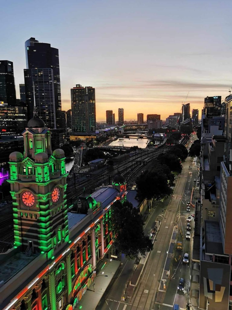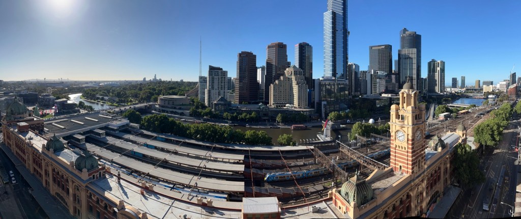 I have booked a standard entry level room using cash and points and upon app check-in I have been upgraded to a Skyline View room with Balcony and it is beautifully appointed, with a large balcony overlooking Flinders St station and beyond. The view in the evening is spectacular! The room is a corner view room with Nespresso machine and decaf coffee pods – perfect for me! There are also 2 bathrobes and slippers for use inside the room.