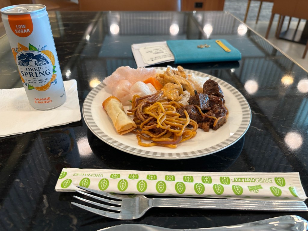 I haven’t had breakfast and there was no food offered on my previous VA flight so I tuck into a delicious array of food at the buffet. And it’s really delicious from red chicken curry with fluffy white rice, Mongolian beef – delicious, and some desserts. Really good and hits the spot.