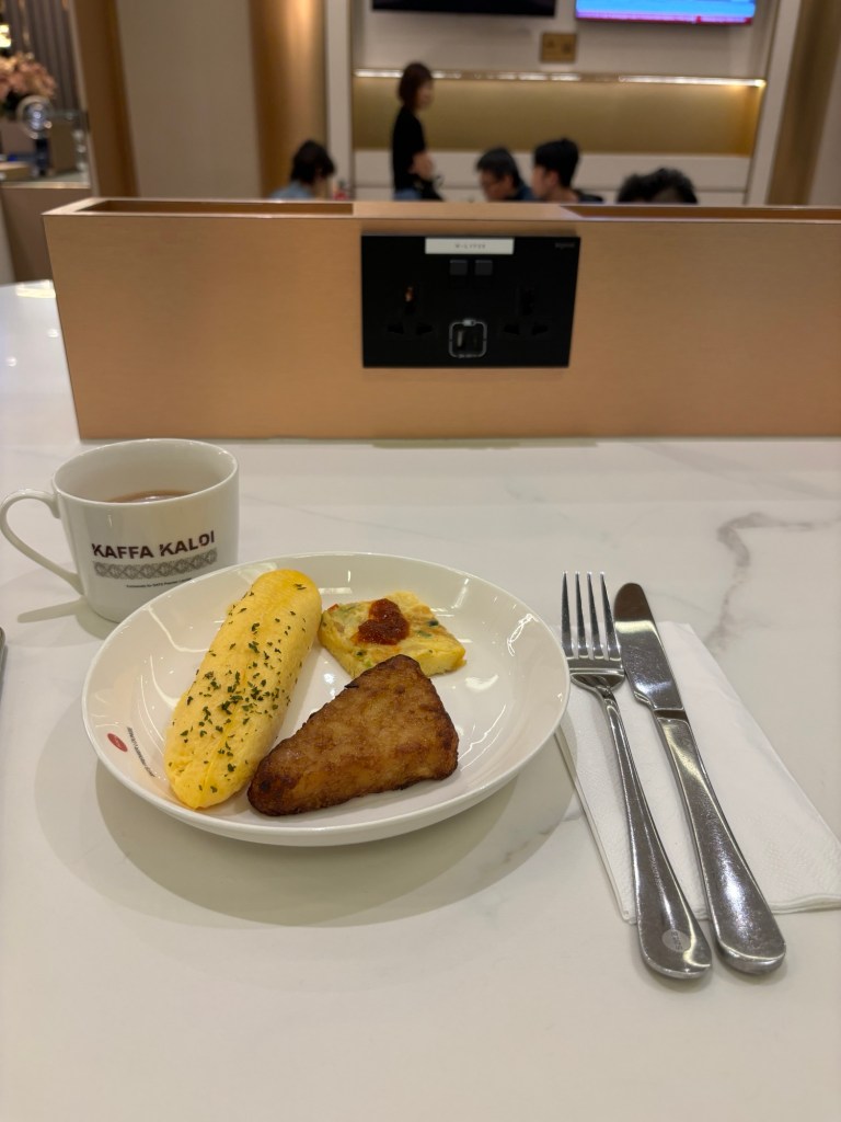 The buffet looks great but the taste ain’t. The omelettes are like rubber, hash browns are luke warm and soggy, and my hot chocolate weak. So I don’t end up eating anything really and wait for my partner to finish whatever he is doing on his laptop before we move towards the boarding gate.