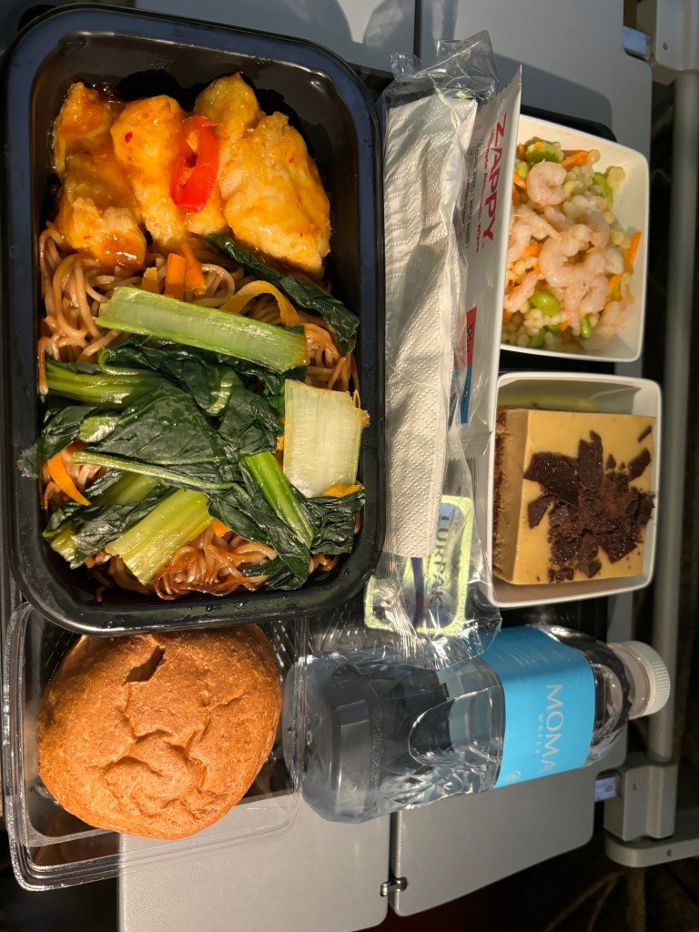 Today there are two meal services and both are Seafood meals as I have pre-ordered them. The first is a very simple snack – a margarita pizza which is ok. A few hours later the main meal comes and it’s a fried fish dish with a tasty dessert.