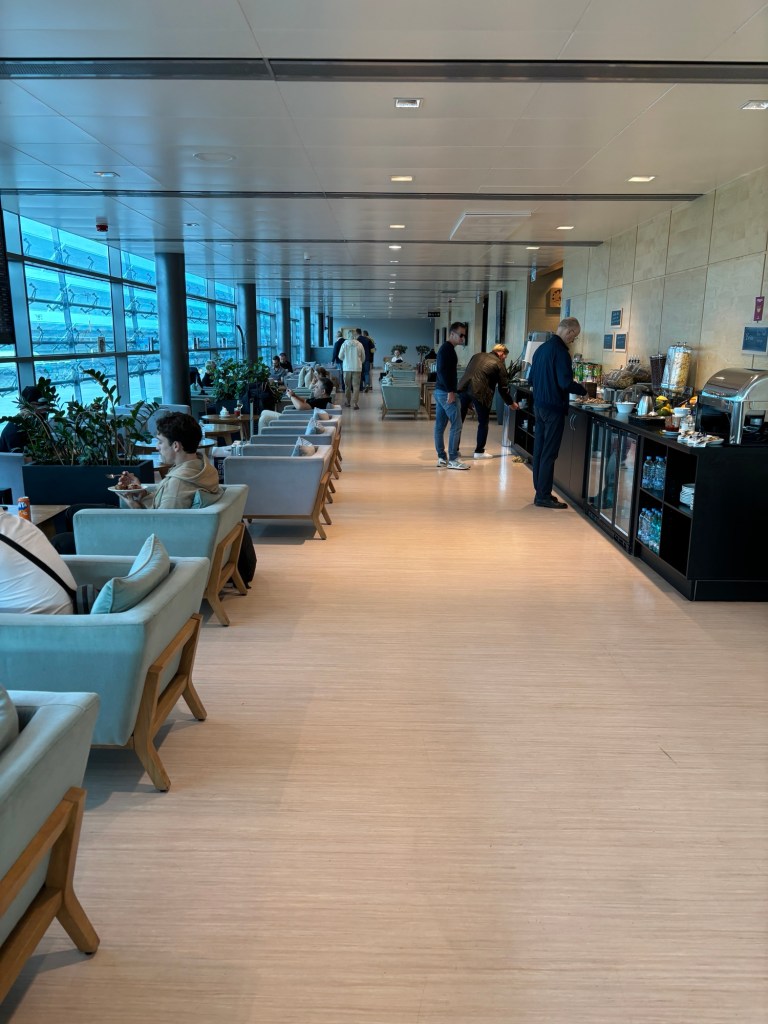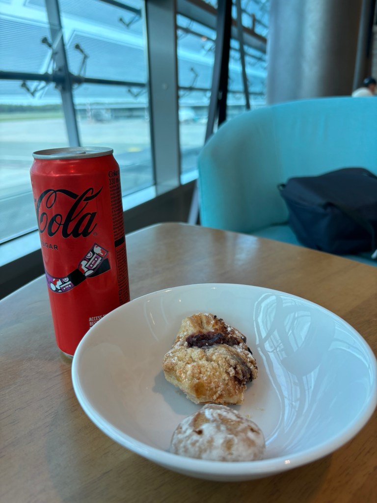 The lounge is long and spacious, airy, modern, bright, and….pretty much empty. I get a window seat and then check out the food buffet. Unfortunately I’m not hungry, so miss out on the salads, meatballs, and beetroot borch soup, but instead try a couple of Latvian cookies and a Diet Coke.
