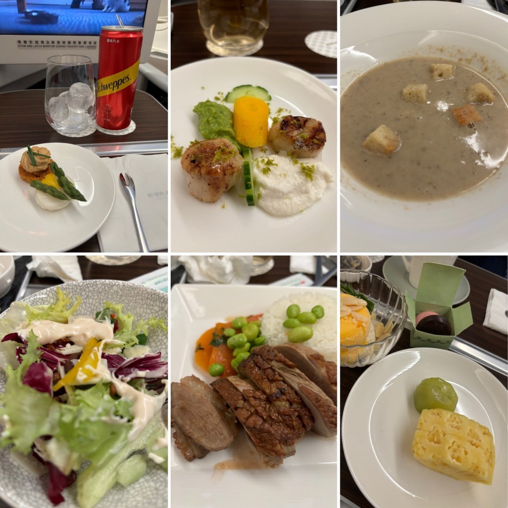 Shortly after take-off the meal service begins. It is delicious. A Foie Gras prelude and scallops hors d’oeuvre, mushroom soup, salad, roast duck main, and a selection of desserts.