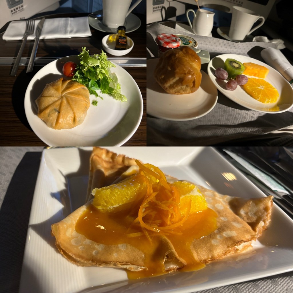 I nod on and off again for a few more hours until breakfast is served: decaf coffee, yogurt, fruit, and crepe Suzette.
