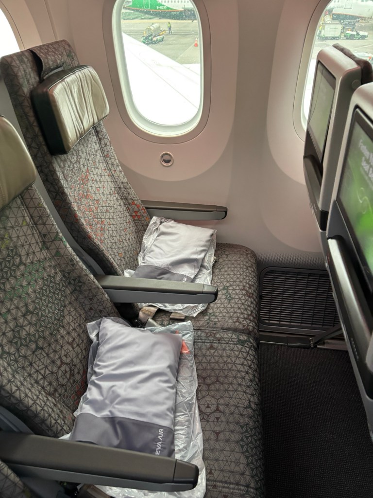 I am sitting in Economy window seat 26A on this EVA airlines Boeing B787-10 flight to Sydney from Taipei.