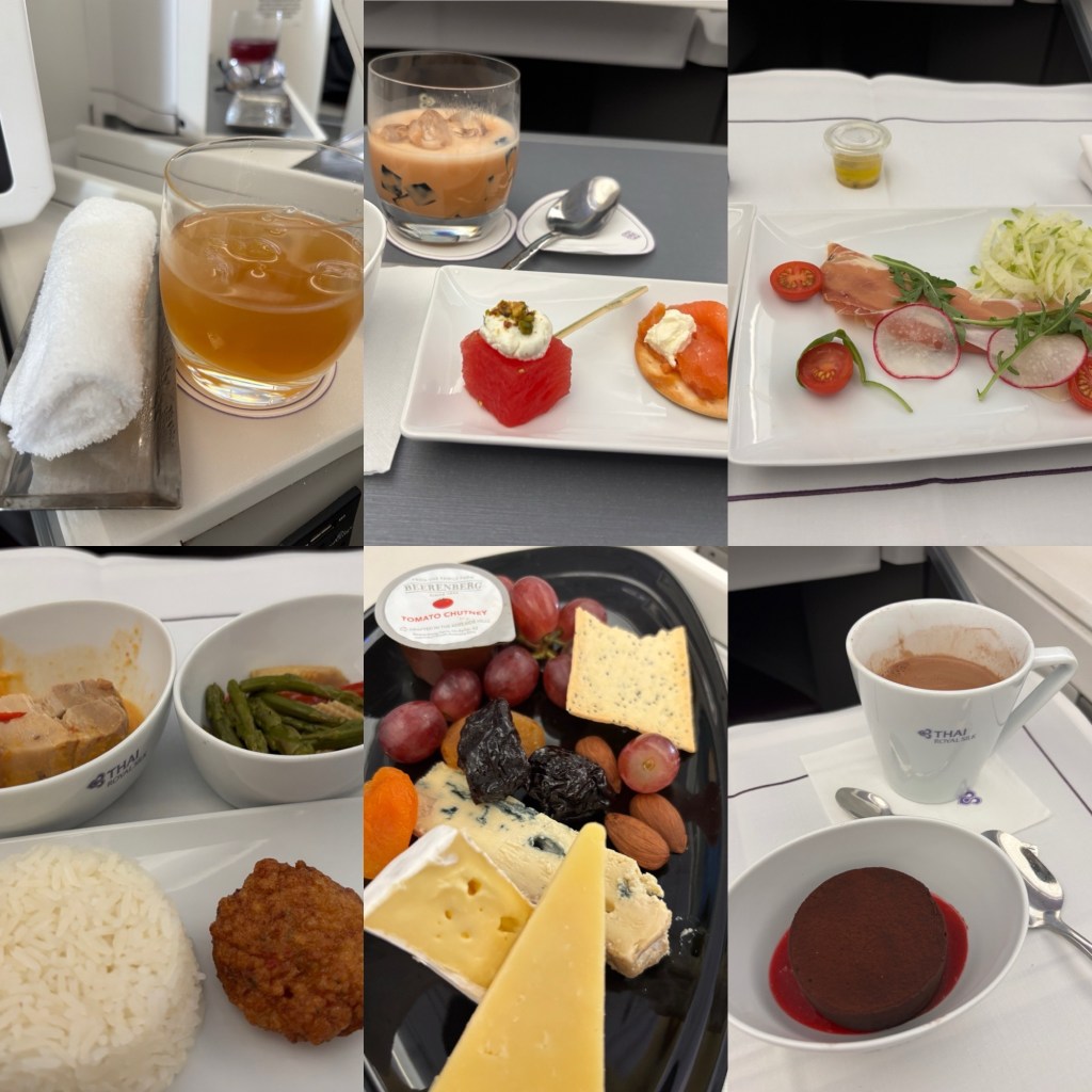 Shortly after takeoff the drinks cart comes around and I get a delicious Ice Thai Milk tea with grass-jelly. This comes with some nuts and an appetizer – smoked salmon and watermelon. It’s delicious. This is followed about 20 mins later with the main course, a red curry and fish cakes. Next is a cheese plate. I’m getting very full……The first meal service finally ends with Chocolate cake and a hot chocolate 😅. It’s delicious.