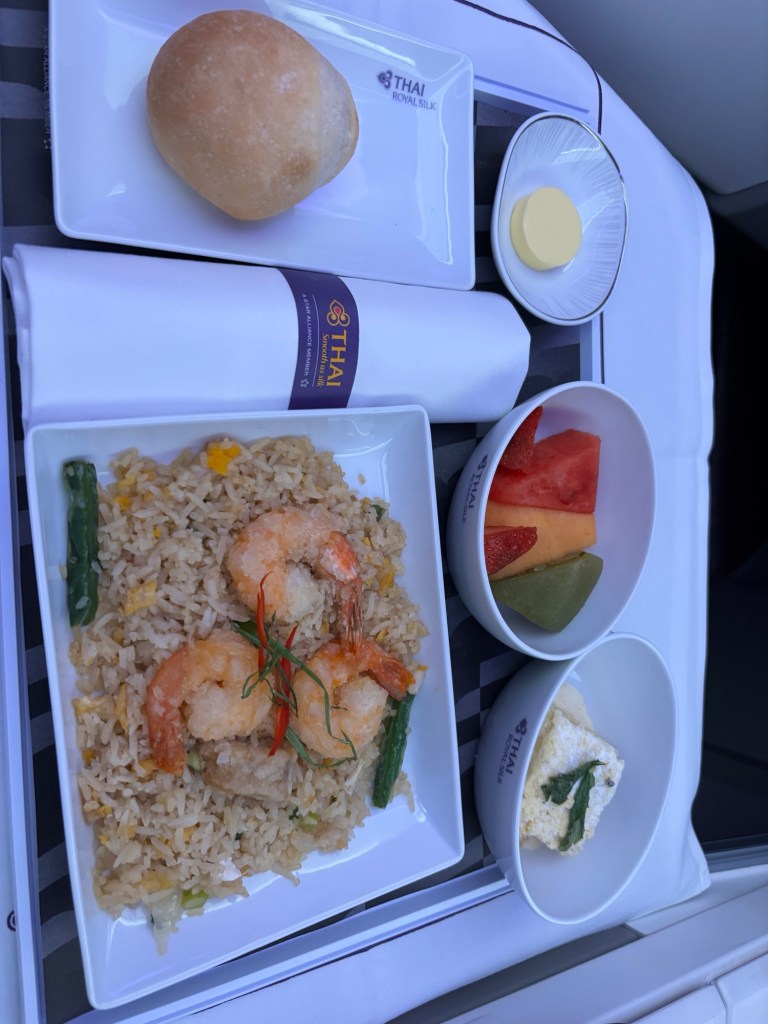I wake up and start watching Nashville season 1 until the end of the flight. During this time the second meal service comes around, after another hot towel service. It’s also delicious – a fried rice with shrimp, fruit, and a delicious apple crumble cake.
